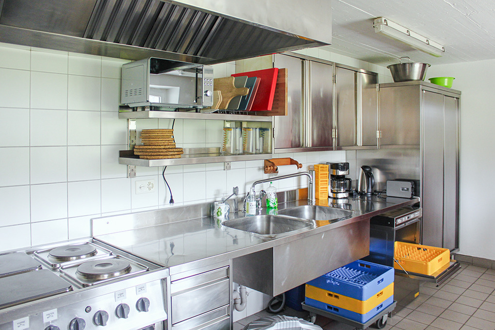 Parterre: Ski- und Skischuhraum. Gute Gruppenküche mit Spülmaschine.
