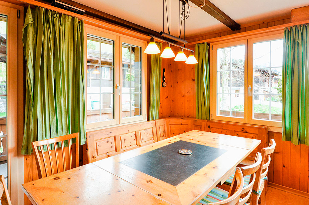 Haus: Sehr schönes Schweizer Holzchalet mit Kamin. 7-Zimmerhaus mit ca. 110 qm Wohnfläche über 3 Etagen. Wohnlich-gemütliche Einrichtung. Internetzugang über W-Lan (Gebühr). Nichtraucherwohnungen. Heizung durch E-Nachtspeicherheizung, Warmwasser über E-Boiler. Waschmaschine, Grill. Garten mit großer Spielwiese am Haus. Pkw-Stellplätze am Haus.