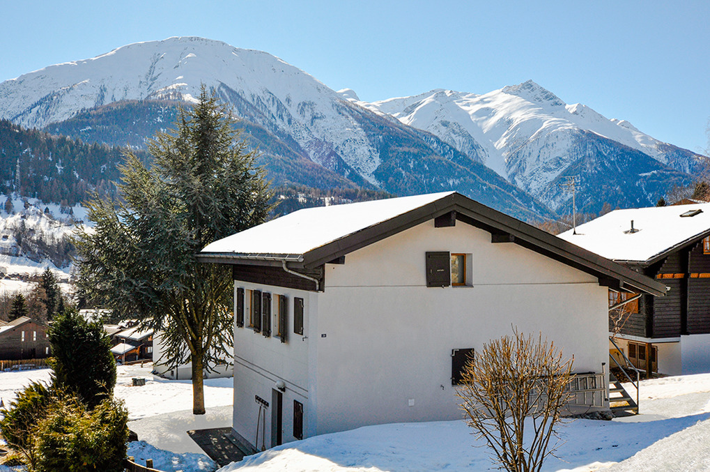 Ort: Fiesch. Freistehend in einer Chaletsiedlung oberhalb des Ortes. Ruhige Hanglage mit schönem Panoramablick auf die umliegende Bergwelt. Bei guter Schneelage Skiabfahrt über Skiroute bis in Hausnähe. Gondel Fiesch 600 m Fußweg, mit dem Pkw 2,3 km. Ortsmitte 1,8 km.