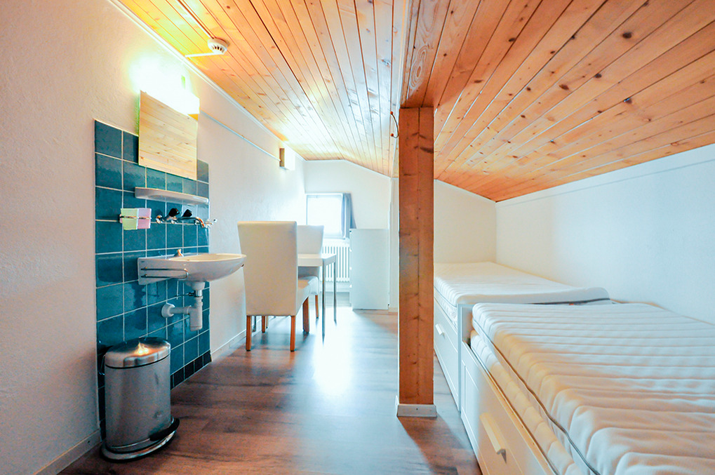Dachgeschoss mit Schrägen: Zwei 2-Bettzimmer mit Einzelbetten, Wb. Einzelzimmer. Bad: Du, Wb, WC.