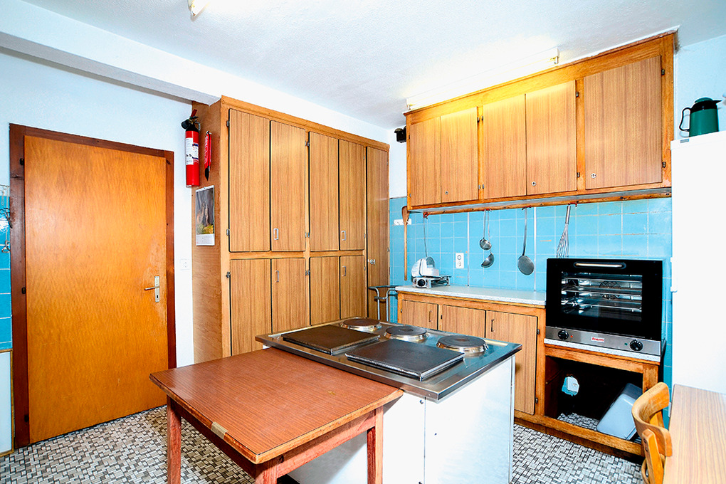 Parterre: Großer Tagesraum (61 qm). Gute Gruppenküche mit Spülmaschine. 2 separate WC, Wb. Telefon.