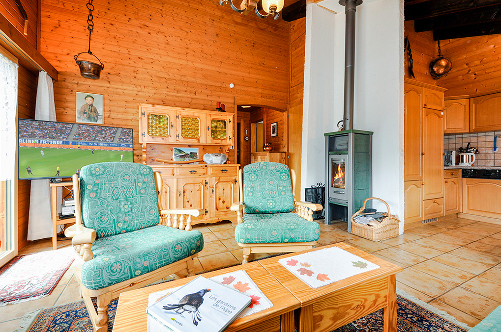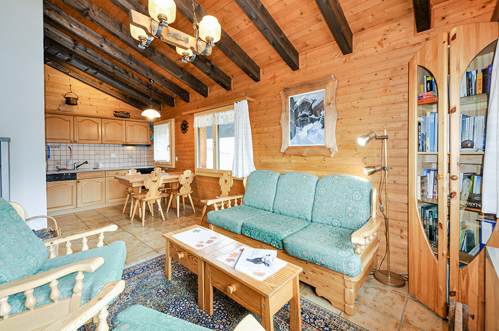 Haus: Schönes Chalet mit zwei Wohnungen. Gemütlich-rustikales Chalet-Ambiente mit Holzvertäfelungen im ganzen Haus. Internet kostenlos über W-Lan. Elektroheizung und Kaminofen (Holz inklusive). Warmwasser über 300 l E-Boiler. Balkon mit Sitzmöbeln. Garten mit Grillkamin (Gemeinschaftsnutzung mit der Parterre-Wohnung). 1 reservierter Pkw-Stellplatz, weiterer Stellplatz auf Anfrage (je nach Verfügbarkeit).