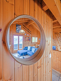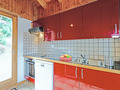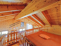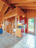 1. Etage: Eingang, Windfang. Schöner bis zum Dachgiebel ausgebauter Wohnraum (35 qm) mit Kamin, Couchgarnitur, Flachbild-Kabel-TV, Radio/CD, Esstisch, neuer Einbauküche (Backofen, Mikrowelle, Spülmaschine). Separates WC. Vom Wohnraum schmale Treppe auf Galerie mit 2 Matratzen unter dem Dachgiebel (max. 1,60 m Höhe).