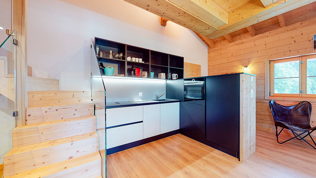 CH 383.70 Wohnung 4-6 Pers.: 3-Zimmerwohnung mit 73 qm Wohnfläche über 2 Etagen. 2. Etage: Zwei Doppelzimmer. Bad: Bw/Du, Wb, WC. Dachgeschoss mit Schrägen: Wohnraum mit Couchgarnitur (Schlafsofa 2 Pers.), TV, Esstisch, Einbauküche (Backofen, Mikrowelle, Spülmaschine). Bad: Du, Wb, WC.