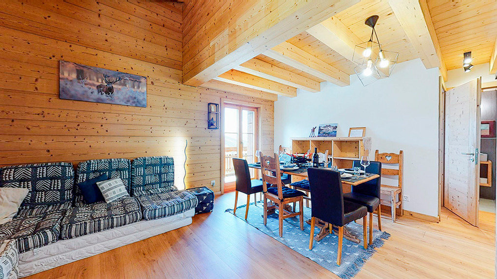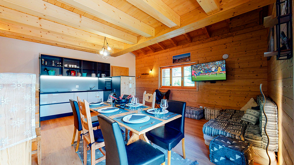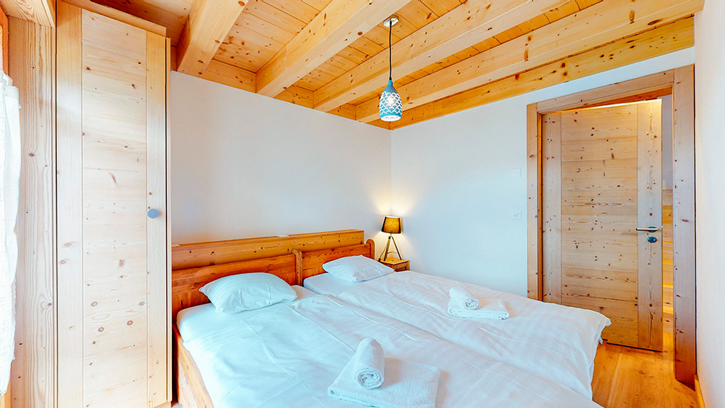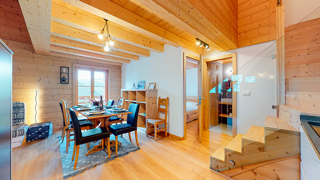 CH 383.71 Wohnung 8-10 Pers.: 5-Zimmerwohnung mit 160 qm Wohnfläche über 2 Etagen. 2. Etage: Großzügiger Wohnraum mit gemütlicher Sitzgruppe (Schlafsofa 2 Pers.), Kaminofen, TV, Esstisch, Einbauküche (Backofen, Mikrowelle, Spülmaschine), Balkon. Zwei Doppelzimmer mit Bad (Du bzw. Bw, Wb, WC). Dachgeschoss mit Schrägen: Zwei Doppelzimmer mit Bad (Du bzw. Bw, Wb, WC). Balkon mit schönem Blick ins Tal und zum gegenüberliegenden Ort La Tzoumaz.