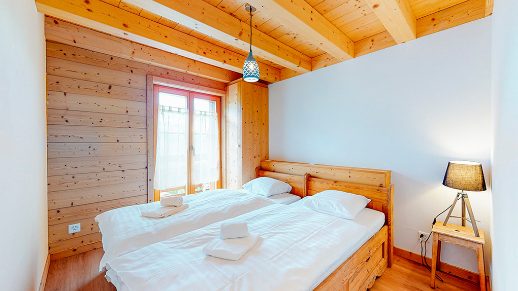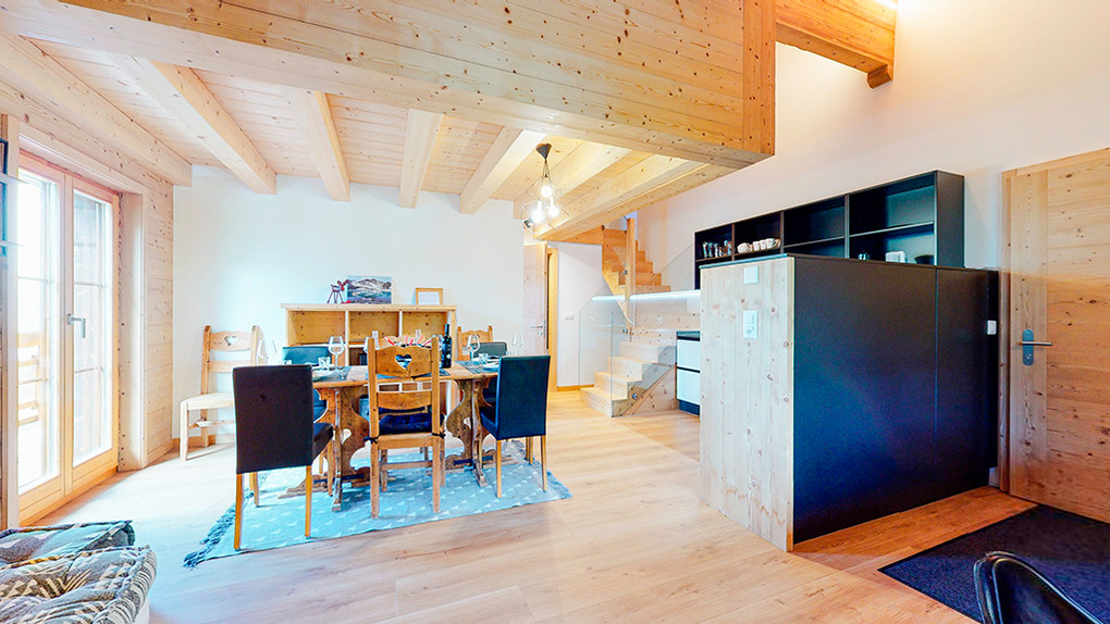 CH 383.70A Wohnung 4-6 Pers.: 3-Zimmerwohnung mit 75 qm Wohnfläche über 2 Etagen. 2. Etage: Wohnraum mit Couchgarnitur (Schlafsofa 2 Pers.), TV, Esstisch, Einbauküche (Backofen, Mikrowelle, Spülmaschine), Balkon. Doppelzimmer. Bad: Du, Wb, WC. Dachgeschoss mit Schrägen: Doppelzimmer. Bad: Bw, Wb, WC.