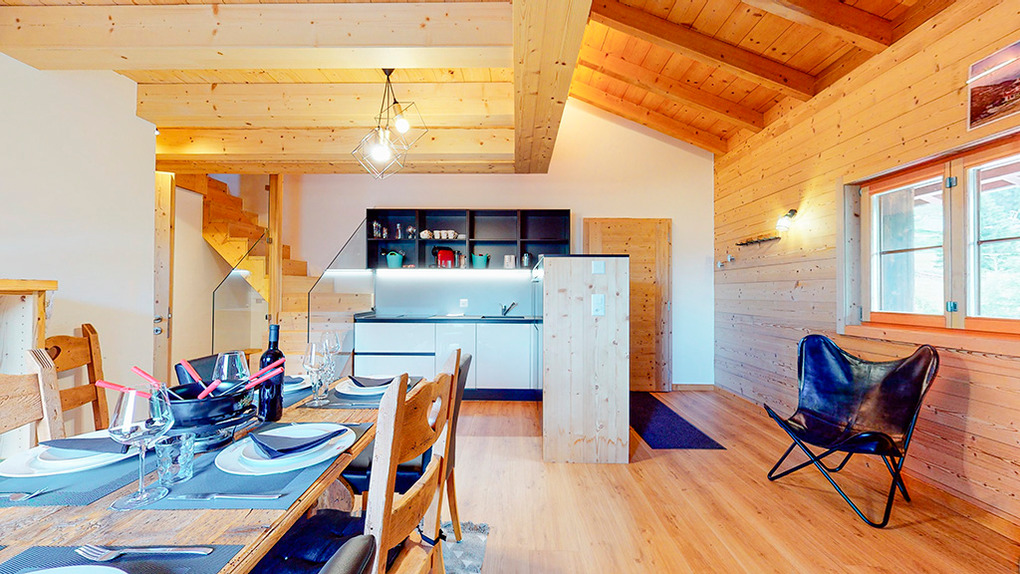 CH 383.73 Chalet 20-38 Pers.: Bei gemeinsamer Anmietung aller vier Wohnungen ergibt sich ein Chalet zum Alleinbewohnen in einzigartiger Lage. Insgesamt 18 Zimmer mit 488 qm Wohnfläche, verteilt auf 4 Fewos und 3 Etagen. 14 Schlafräume, 4 Wohnräume. Gemeinsames Essen für max. 12 und 20 Personen in den Wohnräumen der beiden größeren Wohnungen möglich.