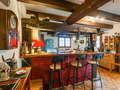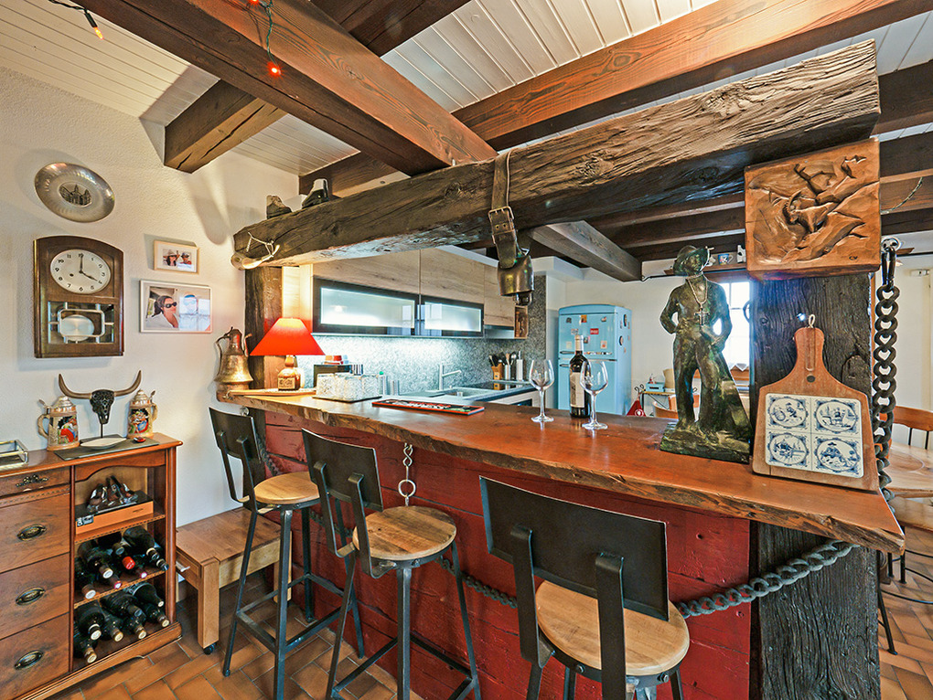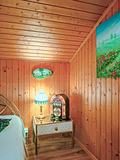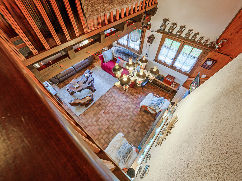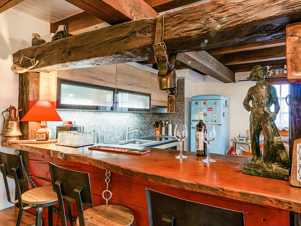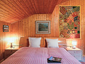 Parterre: Windfang mit Garderobe. Großzügig bis zum Dachgiebel ausgebauter Wohnraum mit gemütlicher Sitzgruppe am Kamin, TV, DVD, Blutooth-Radio, Esstisch, thekenartig abgetrennter, gut ausgestatteter Küche (Backofen, Spülmaschine, Wein-Kühlschrank), Balkon. Bad: Bw/Du, Wb, WC. Vom Wohnraum Treppe in die