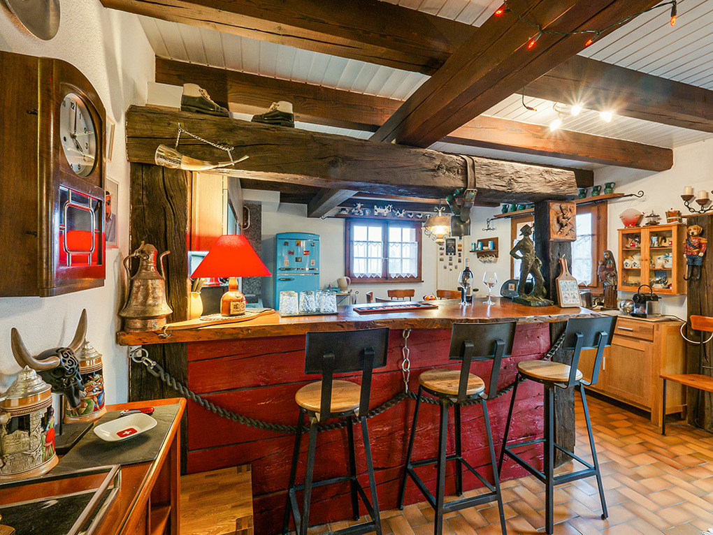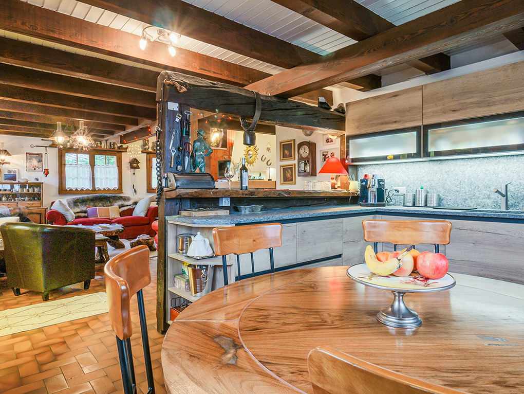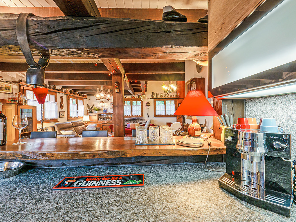 Haus: Schönes Chalet mit Kamin. 4-Zimmer-Chalet mit 120 qm Wohnfläche über 2 Etagen. Gemütliches Ambiente durch Holzvertäfelung in fast allen Räumen. Internet kostenlos über W-Lan. Waschmaschine. Öl-Zentralheizung. Warmwasser über 200 l E-Boiler. Im Tiefparterre: Spielzimmer mit Mini-Kicker, Skiraum. Balkon, Terrasse (Sitzmöbel). 2 Pkw-Stellplätze vorhanden (40 m entfernt, danach Fußweg zum Chalet).