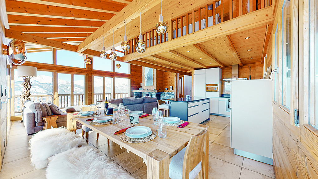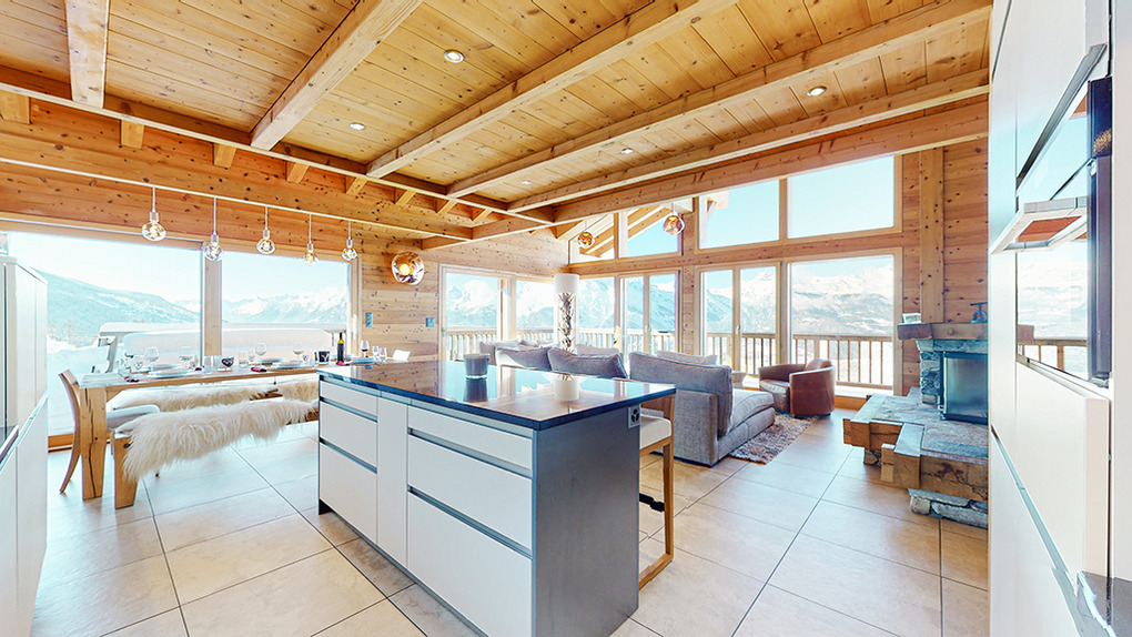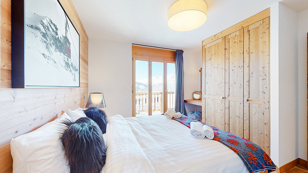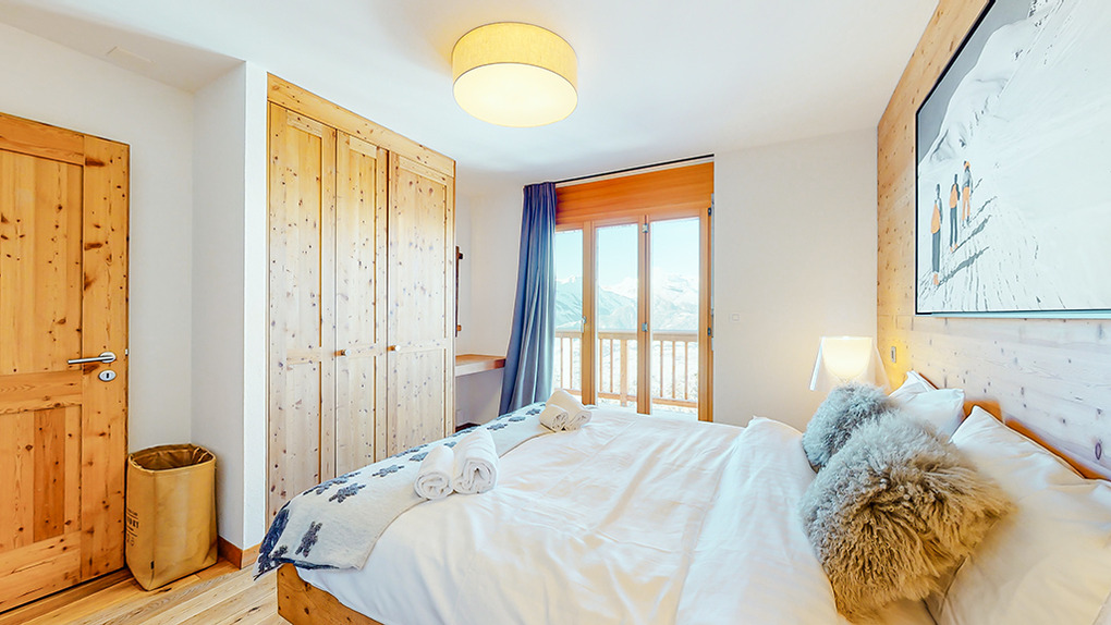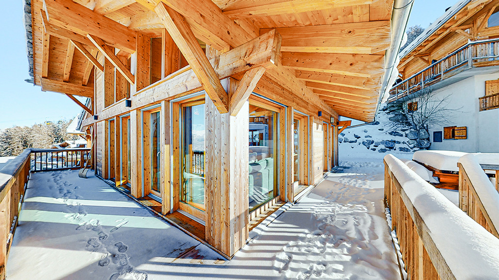 Ort: Veysonnaz. Top-Lage oberhalb des Ortes direkt an der beschneiten Talabfahrt. Ruhige Hanglage mit sehr schönem Panoramablick ins Rhône-Tal und auf die Piste. Skiabfahrt vom und bis zum Haus! Ortsmitte ca. 1,5 km mit dem Pkw, Gondelstation nur 120 m auf Skiern. Schwimmbad (Eintritt im Mietpreis enthalten) mit Dampf-/Sauna, Whirlpool (ermäßigter Eintritt). Zufahrt mit Winterausrüstung bis zum Haus. Garage für 1 Pkw, 1-2 weitere Parkplätze am Haus. Öffentlicher Parkplatz ca. 1 km, Parkhaus 1,5 km (Gebühr).