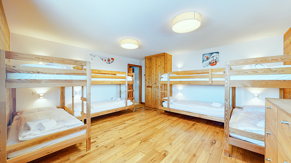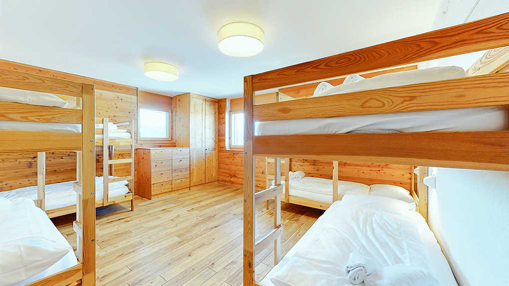 Parterre: Großes 8-Bettzimmer mit 4 Etagenbetten, Bad (Du, 2 Wb, WC).