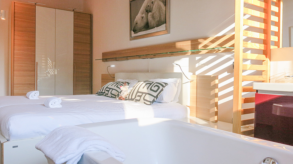 CH 385.31 Wohnungen 6-8 Pers.: 4 Zimmer, 100 qm. Wohnraum mit Sitzgruppe (Schlafsofa 2 Pers.), TV, Radio/CD, Esstisch, Küchenzeile, Balkon. Drei Doppelzimmer (teils mit franz. Bett). Zwei Bäder/WC.