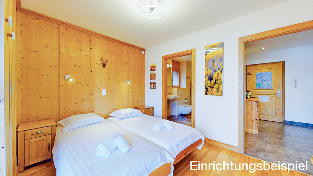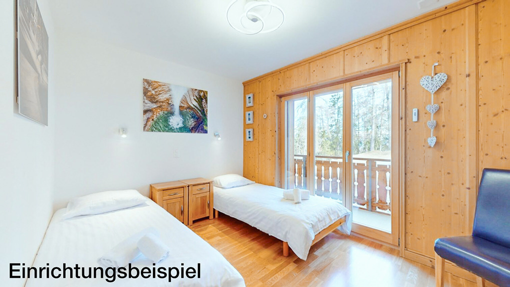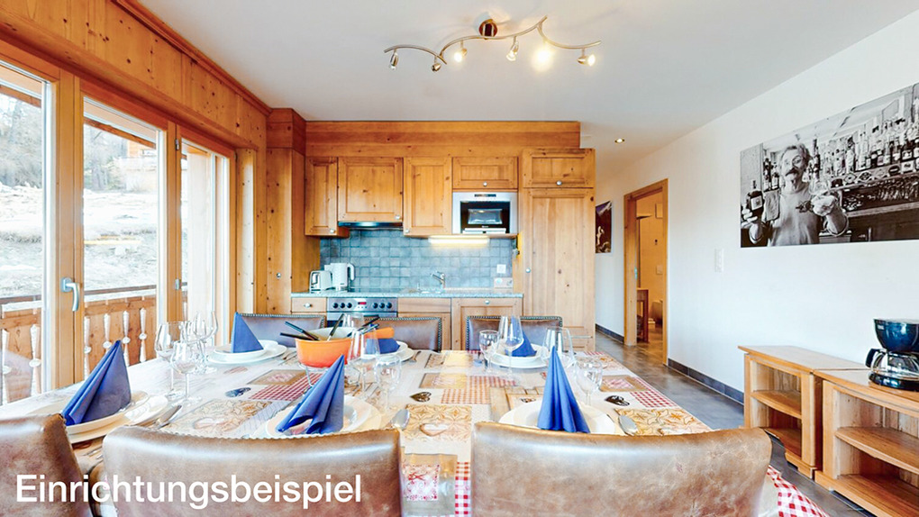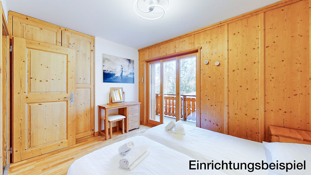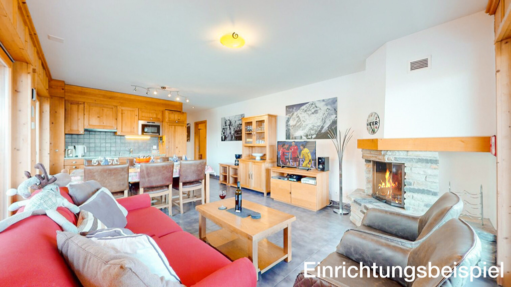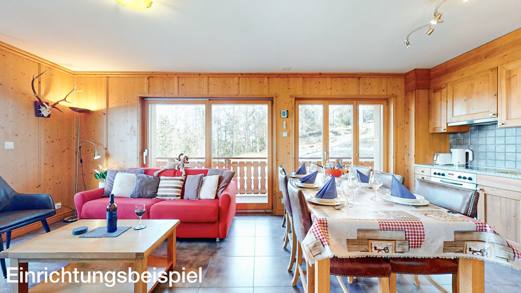 CH 385.38 Wohnung 6-8 Pers.: 4 Zimmer, 110 qm. Großer Wohnraum mit Kamin, Sitzgruppe (Schlafsofa 2 Pers.), TV, Esstisch, Küchenzeile. Zwei Doppelzimmer mit Bad (Bw/Du, Wb, WC). Doppelzimmer. Bad: Du, Wb, WC.