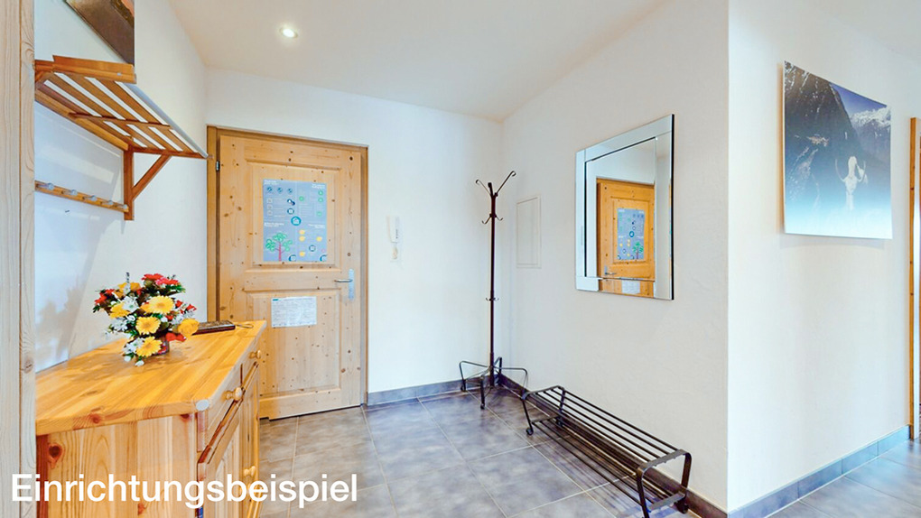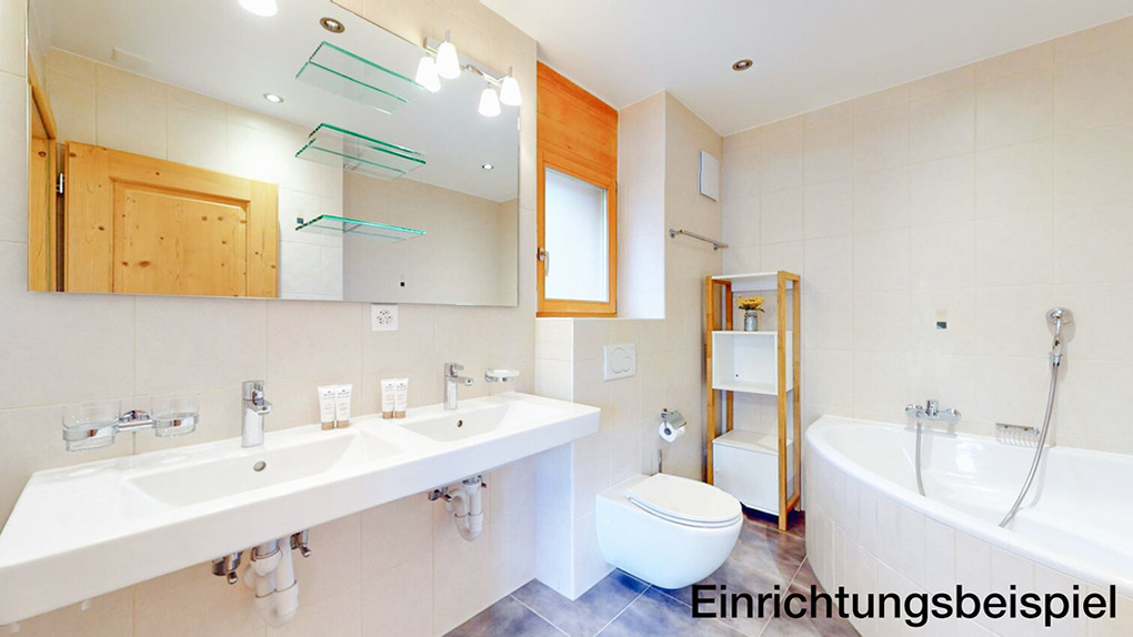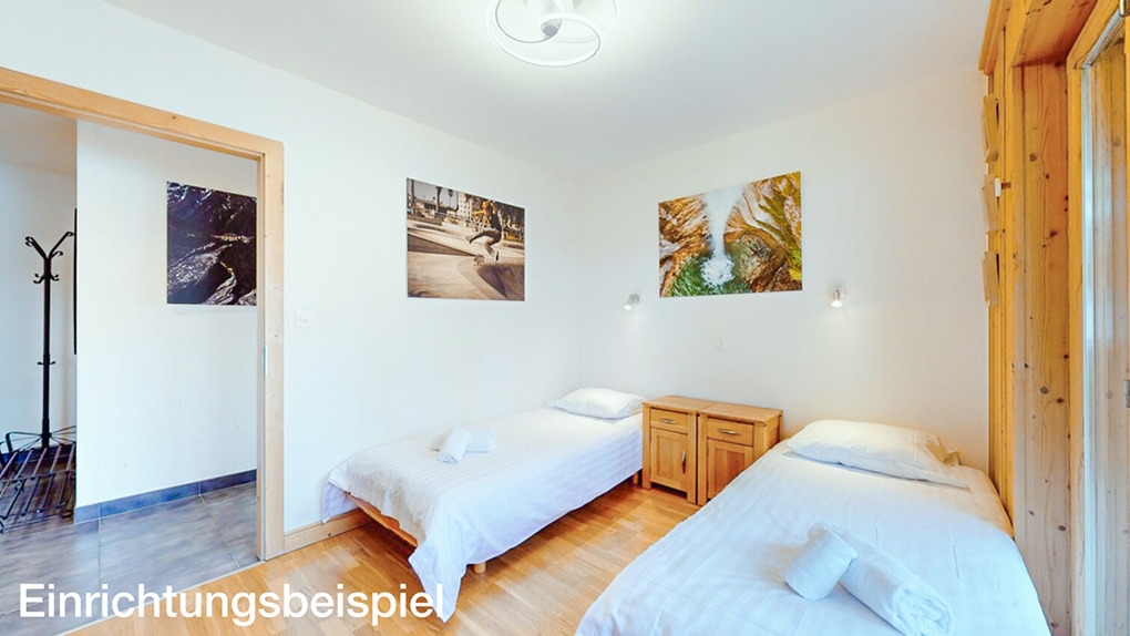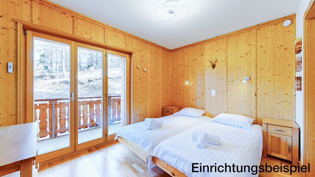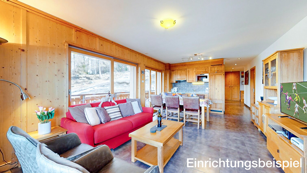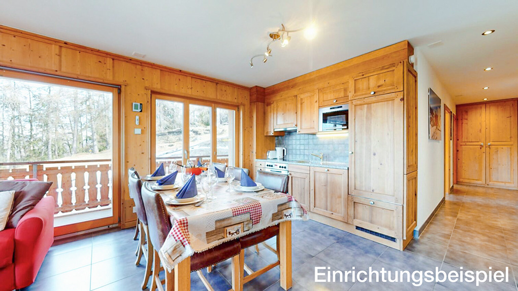 CH 385.38 Wohnung 6-8 Pers.: 4 Zimmer, 110 qm. Großer Wohnraum mit Kamin, Sitzgruppe (Schlafsofa 2 Pers.), TV, Esstisch, Küchenzeile. Zwei Doppelzimmer mit Bad (Bw/Du, Wb, WC). Doppelzimmer. Bad: Du, Wb, WC.