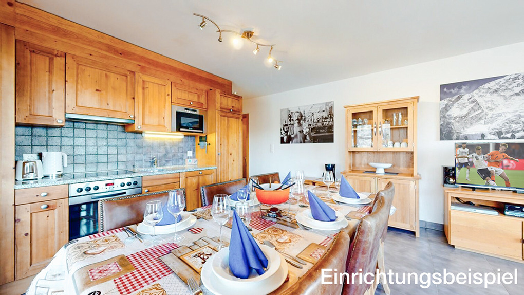 CH 385.39 Wohnung 6-10 Pers.: 4 Zimmer, 158 qm über zwei Etagen. 2. Etage: Großer Wohnraum mit Kamin, Sofa-Sitzgruppe, Curve-TV, Esstisch, sehr gut ausgestatteter Küchenzeile. Zwei 3-Bettzimmer mit franz. Bett, Einzelbett auf Schlafempore. Bad (Bw, 2 Wb, WC, Waschmaschine). Weiteres Bad: Massagedusche, 2 Wb, WC. Dachgeschoss: Doppelzimmer. Schönes Doppelzimmer mit Bad (Du, Wb, WC). Hinweis: bitte beachten Sie, dass die Wohnung mit maximal 8 Erwachsenen belegt werden darf und gegebenenfalls 2 kleinen Kindern bis 4 Jahren.