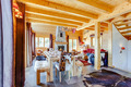 1. Etage: Windfang mit Garderobe. Sehr schöner, großzügig bis in den Dachgiebel ausgebauter Wohnraum (50 qm) mit Panoramafensterfront, gemütlicher Ledersitzgruppe am Kamin, Stereoanlage mit i-Pod-Anschluss, Esstisch, moderner Einbauküche (Backofen, Mikrowelle, Spülmaschine). Separates WC.