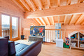 1. Etage: Windfang mit Garderobe. Sehr schöner, großzügig bis in den Dachgiebel ausgebauter Wohnraum (50 qm) mit Panoramafensterfront, gemütlicher Sitzgruppe am Kamin, Flachbild-Sat-TV, Esstisch, moderner Einbauküche (Backofen, Mikrowelle, Spülmaschine). Separates WC.