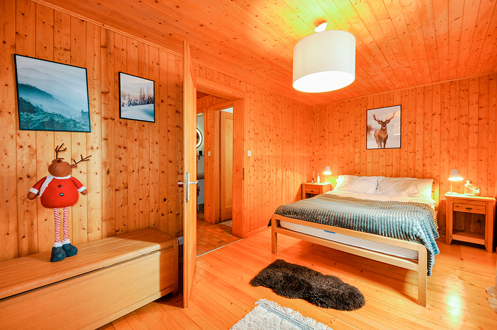 1. Etage (Hanglage): Windfang mit Garderobe. Wohnraum (35 qm) mit gemütlicher Sitzgruppe, Kamin (nur Dekor!), Kabel-TV, Esstisch, moderner Einbauküche (Backofen, Mikrowelle, Spülmaschine), Balkon. Doppelzimmer mit franz. Bett. Bad: Bw/Du, Wb, WC. Steile Treppe ins ausgebaute