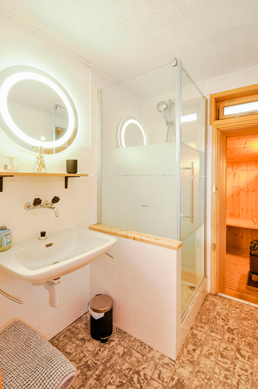 Parterre: Doppelzimmer mit franz. Bett. Doppelzimmer mit franz. Bett, Terrasse. 2-Bettzimmer mit Einzelbett, Ausziehbett. Bad: Du, Wb, Sauna. Separates WC.