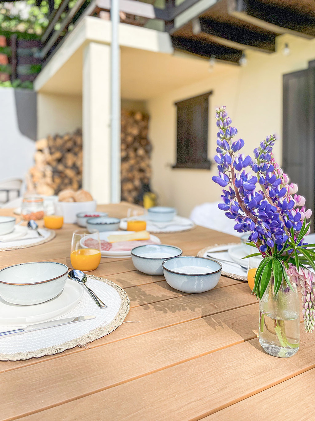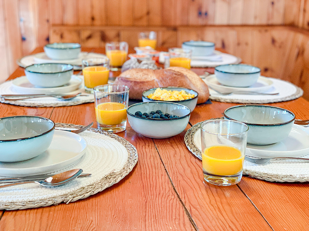 1. Etage (Hanglage): Windfang mit Garderobe. Wohnraum (35 qm) mit gemütlicher Sitzgruppe, Kamin (nur Dekor!), Kabel-TV, Esstisch, moderner Einbauküche (Backofen, Mikrowelle, Spülmaschine), Balkon. Doppelzimmer mit franz. Bett. Bad: Bw/Du, Wb, WC. Steile Treppe ins ausgebaute