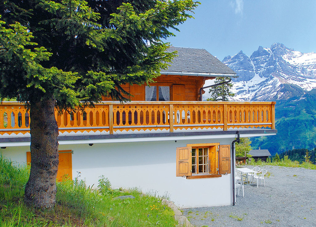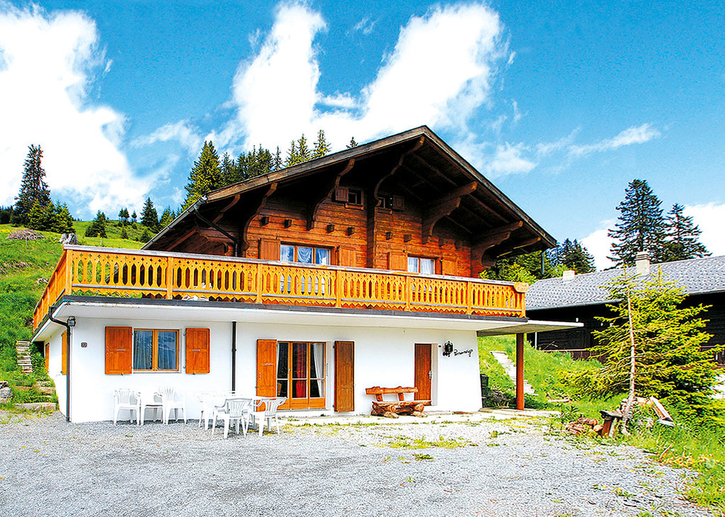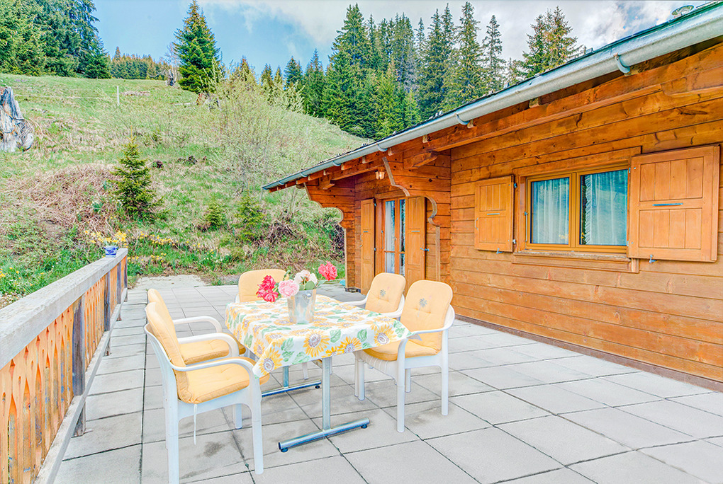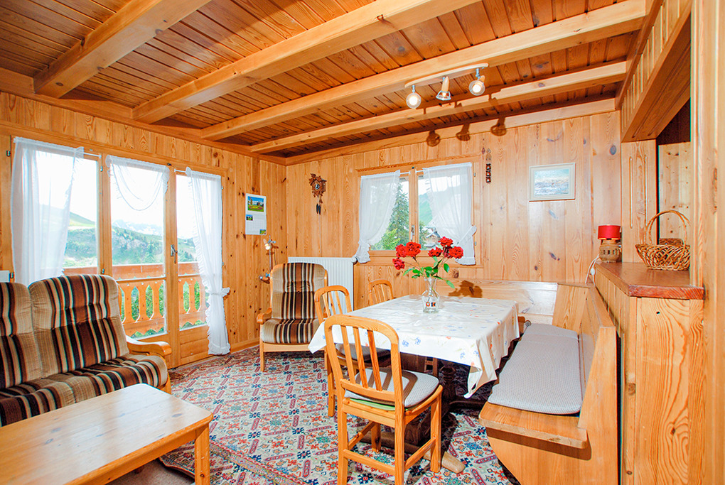 Haus: Schönes Chalet mit Kaminofen. 4-Zimmerwohnung, ca. 90 qm Wohnfläche über 2 Etagen, nur für Nichtraucher. Kostenloser Internetzugang über W-Lan. Gemütliches Ambiente durch Holzvertäfelung. E-Heizung. Warmwasser über 150 l E-Boiler. Separate Fewo im Parterre. Gemeinschafts-Skiraum.