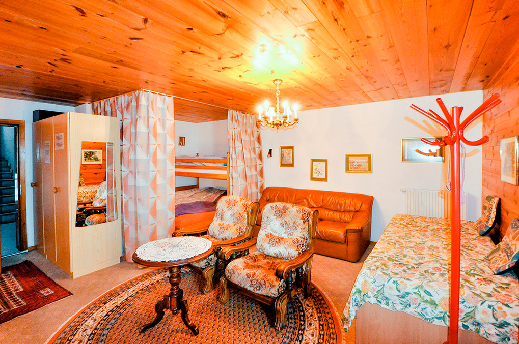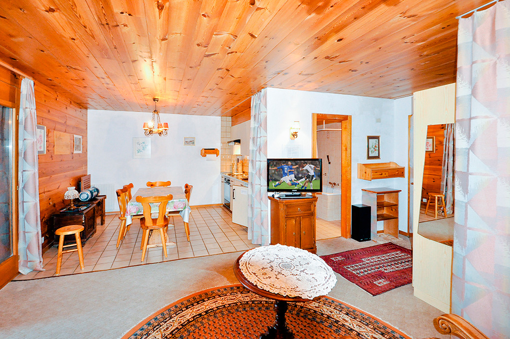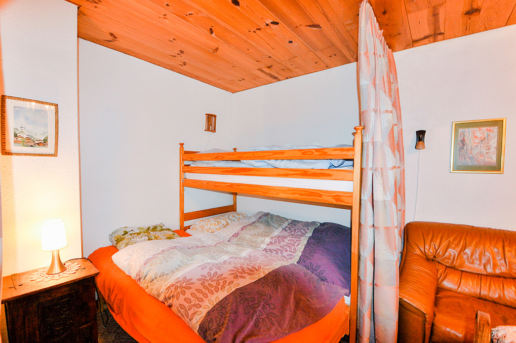 CH 431.65 Wohnungen 6-8 Pers.: 4-Zimmerwohnung, 113 qm Wohnfläche über 2 Etagen. 3. Etage: Großer, bis zum Dachgiebel ausgebauter Wohnraum mit Sitzgruppe, TV, Radio/CD, Esstisch, Küchenzeile (Backofen, Mikrowelle, Spülmaschine). Doppelzimmer. Bad: Bw/Du, Wb, WC. Vom Wohnraum Treppe ins Dachgeschoss (Schrägen): Schlafraum mit 2 Einzelbetten auf Galerie, offen zum Wohnraum. Doppelzimmer. 2-Bettzimmer. Bad: Du, Wb, WC. Süd-Balkon.