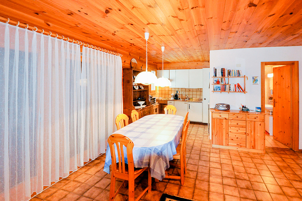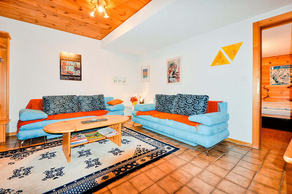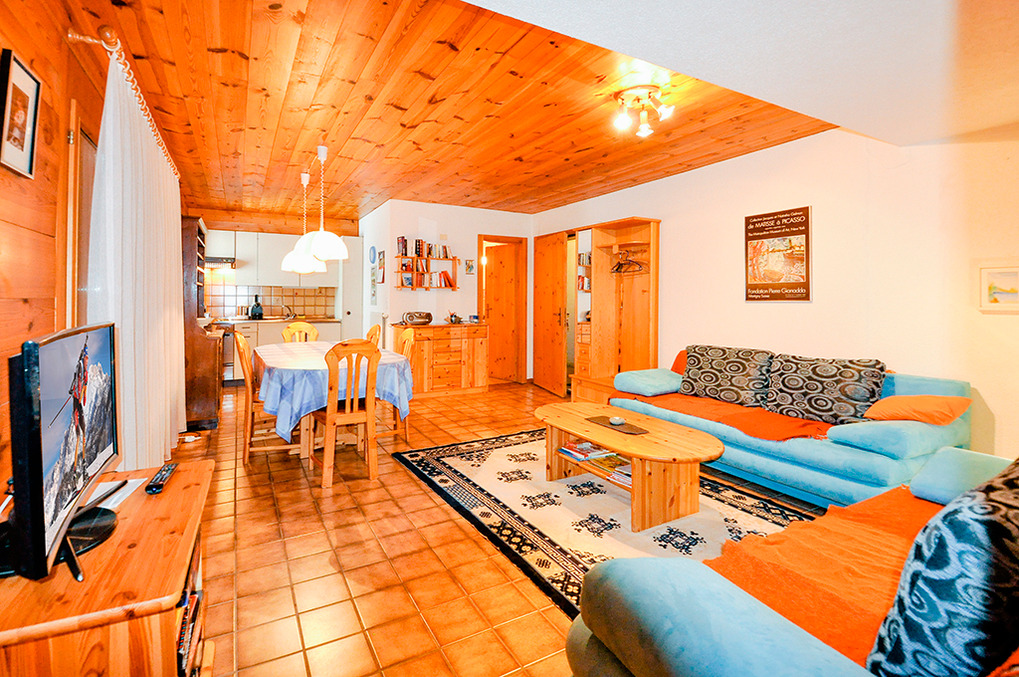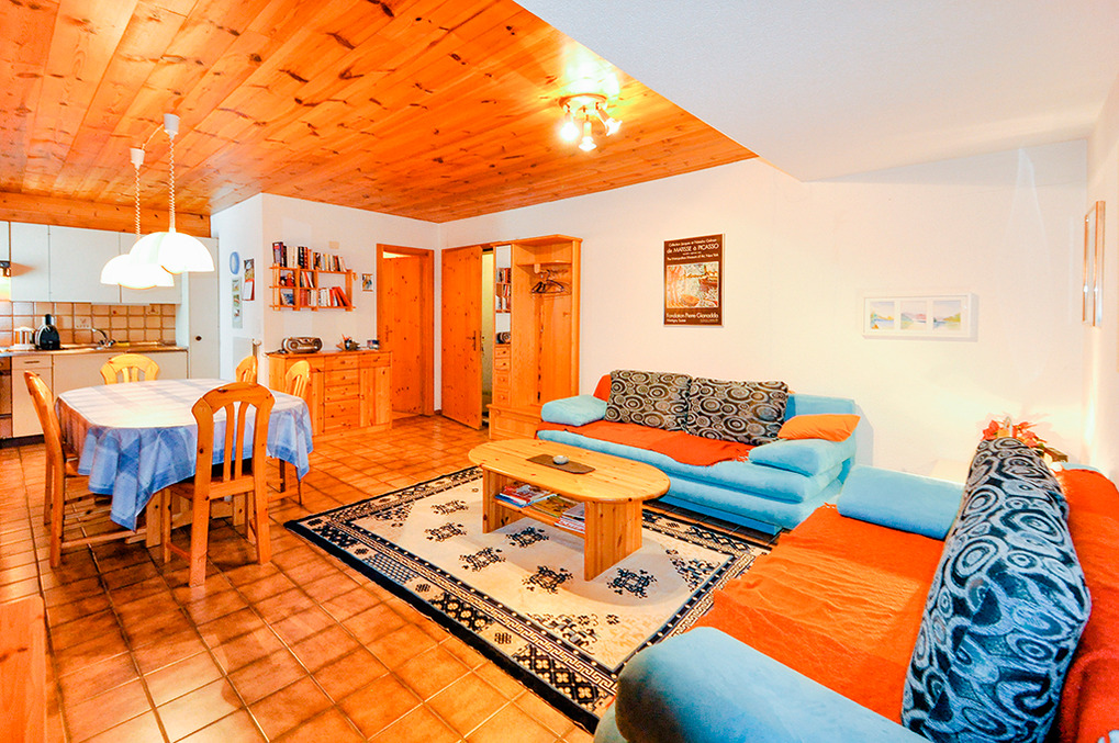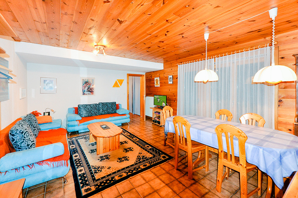 CH 431.65 Wohnungen 6-8 Pers.: 4-Zimmerwohnung, 113 qm Wohnfläche über 2 Etagen. 3. Etage: Großer, bis zum Dachgiebel ausgebauter Wohnraum mit Sitzgruppe, TV, Radio/CD, Esstisch, Küchenzeile (Backofen, Mikrowelle, Spülmaschine). Doppelzimmer. Bad: Bw/Du, Wb, WC. Vom Wohnraum Treppe ins Dachgeschoss (Schrägen): Schlafraum mit 2 Einzelbetten auf Galerie, offen zum Wohnraum. Doppelzimmer. 2-Bettzimmer. Bad: Du, Wb, WC. Süd-Balkon.