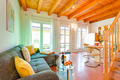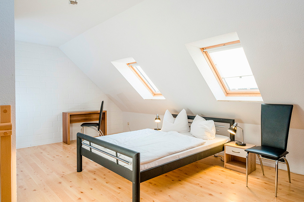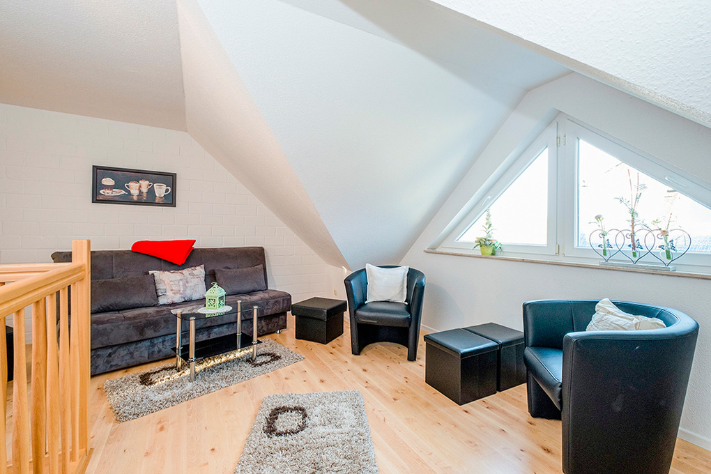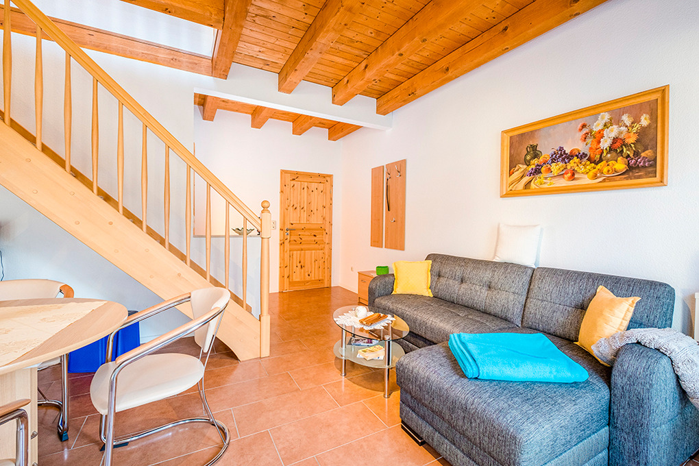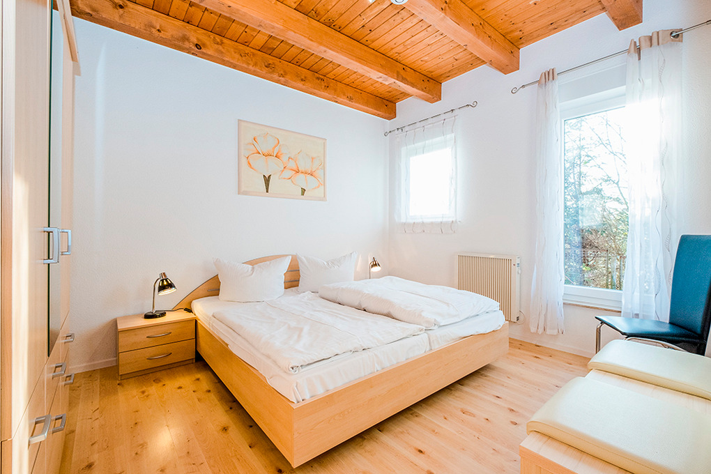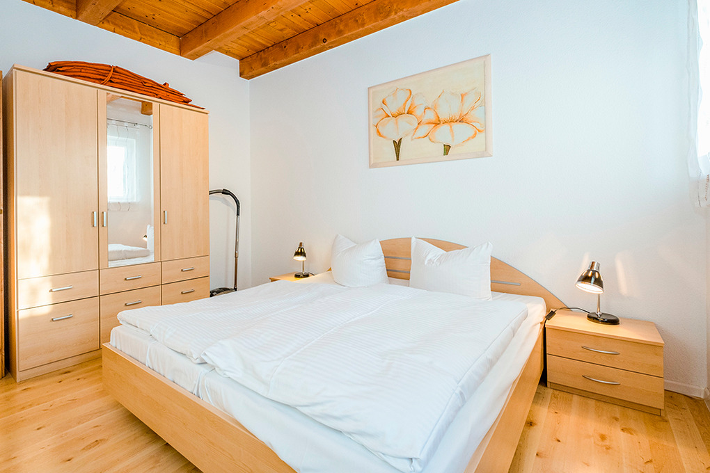 D 15.6 Ferienhaus 2-4 Pers.: 2 1/2-Zimmerhaushälfte, 80 qm Wohnfläche über 2 Etagen. Parterre: Heller Wohn-/Essraum mit Sitzecke, Esstisch, moderner Küchenzeile (Backofen, Mikrowelle). Doppelzimmer. Bad/WC. Treppe in die 1. Etage (leichte Dachschrägen): großzügiger, offener Wohn-/Schlafbereich mit Sitzecke, Sat-TV, 2 Einzelbetten (D 15.6 mit 2 separaten Schlafzimmern). Terrasse mit Sitzmöbeln, Wasserblick (nur bei D 15.6). Grill.