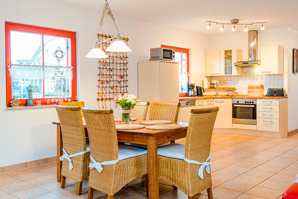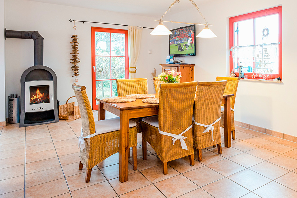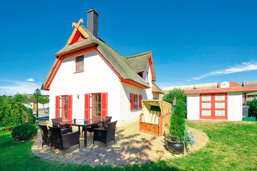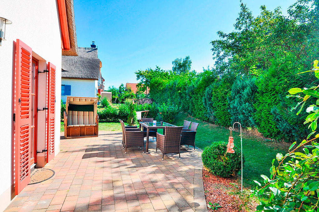 Haus: Komfortables Reetdachhaus mit Kaminofen. Gemütliche Atmosphäre durch geschmackvolle Einrichtung. Nichtraucherhaus. Kostenloser Internetzugang über W-Lan. Zentralheizung. Terrasse mit Sitzmöbeln, Grill, Strandkorb. Kleiner Fahrradschuppen. 2 Pkw-Stellplätze am Haus.