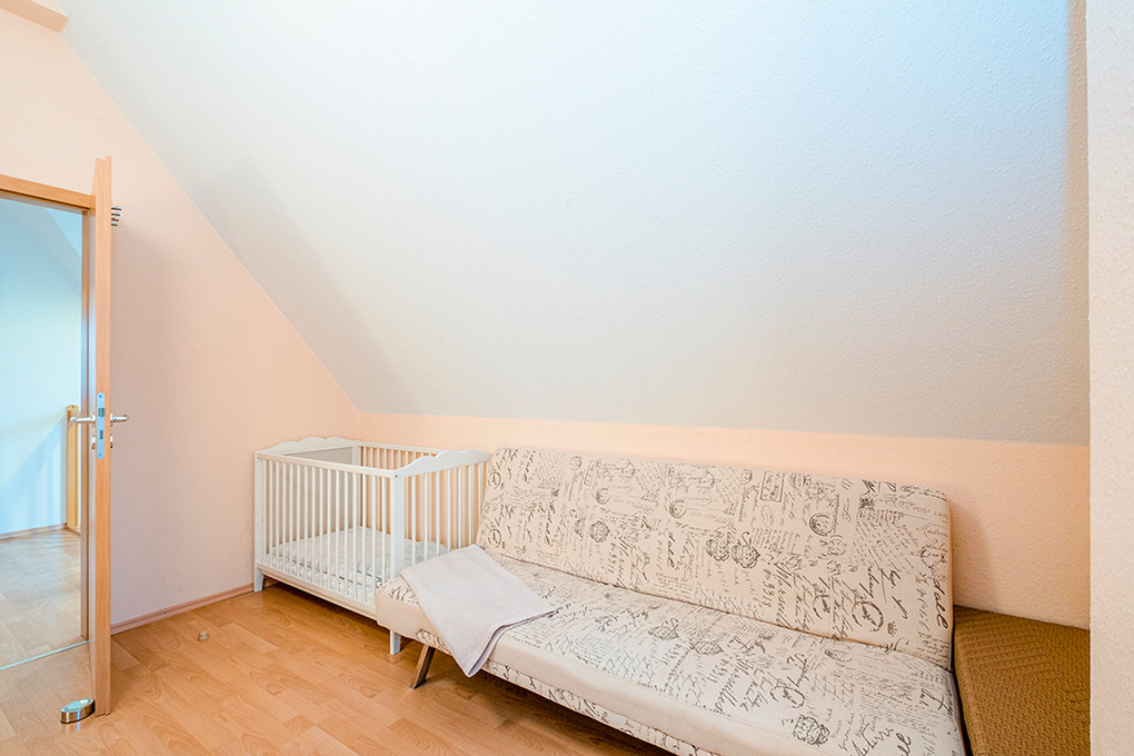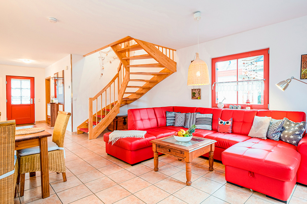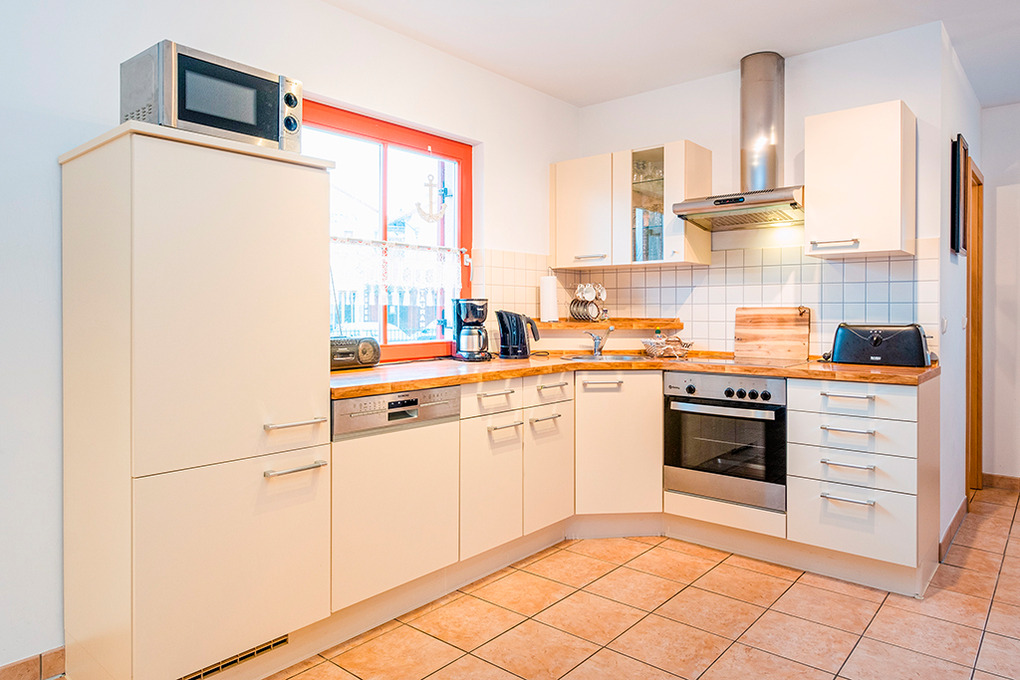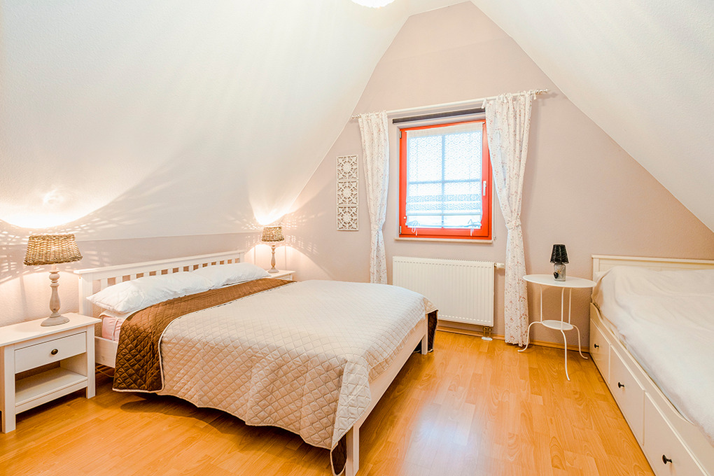 D 16.6 Ferienhaus 4-8 Pers.: Schönes 3-Zimmerhaus mit 91 qm Wohnfläche über 2 Etagen. Parterre: Gemütlicher Wohn-/Essraum mit Kaminofen, Couchgarnitur (Ausziehcouch 2 Pers.), gr. Sat-TV, Radio/CD, Esstisch, moderner Einbauküche (Backofen, Mikrowelle, Spülmaschine). Abstellraum. Bad/WC. 1. Etage: Doppelzimmer mit Sitzecke, Kinderbett (1,20 m Länge). 4-Bettzimmer mit Doppelbett, Einzelbett, Ausziehbett. Bad/WC.