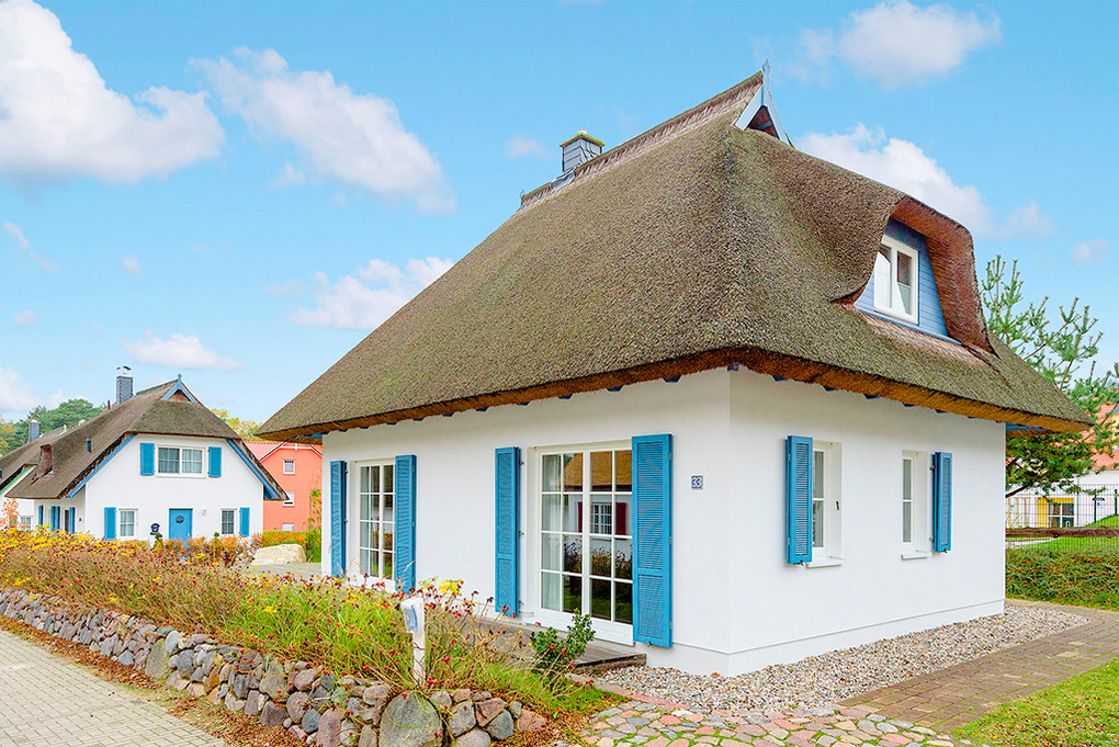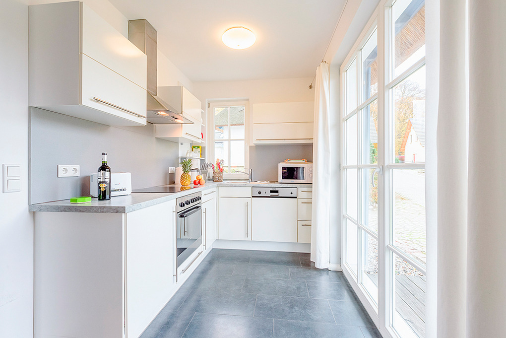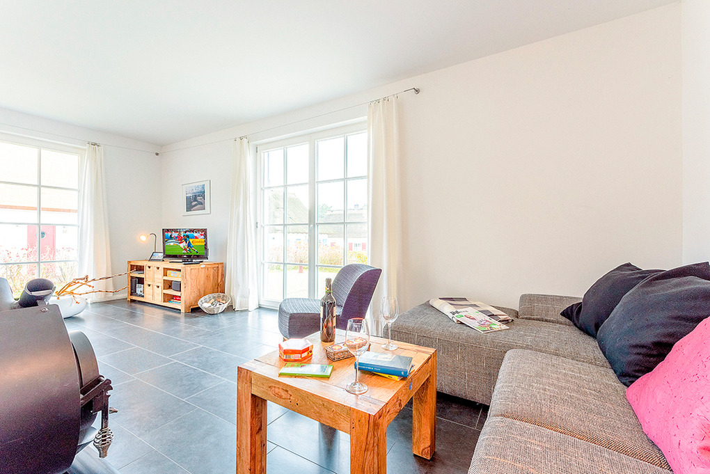 Haus: Schönes Reetdachhaus mit Kaminofen. Moderne Ausstattung, geschmackvolle Möblierung. Zentral-/Fußbodenheizung. Waschmaschine. Nichtraucherhaus. Kostenloser Internetzugang über Wlan. Große Terrasse mit Sitzmöbeln, Grill. Hübscher kleiner Garten. Gartenhaus für Fahrräder. 2 Pkw-Stellplätze am Haus.