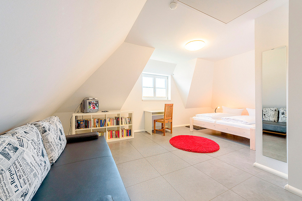 D 16.8 Ferienhaus 3-6 Pers.: 3-Zimmerhaus mit 90 qm Wohnfläche über 2 Etagen. Parterre: Heller Wohn-/Essraum mit Kaminofen, Couchgarnitur, Sat-TV, DVD, Radio/CD, Esstisch, moderner Küchenzeile (Backofen, Mikrowelle, Spülmaschine). Abstellraum. Bad/WC. 1. Etage: Großes Doppelzimmer. 4-Bettzimmer mit Doppelbett, Schlafcouch (2 Pers.).