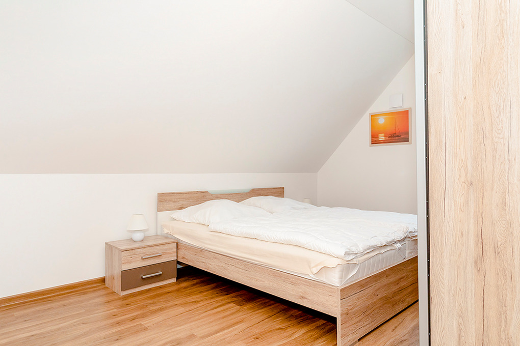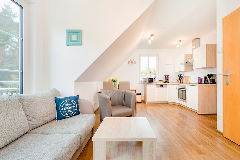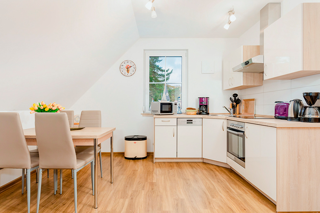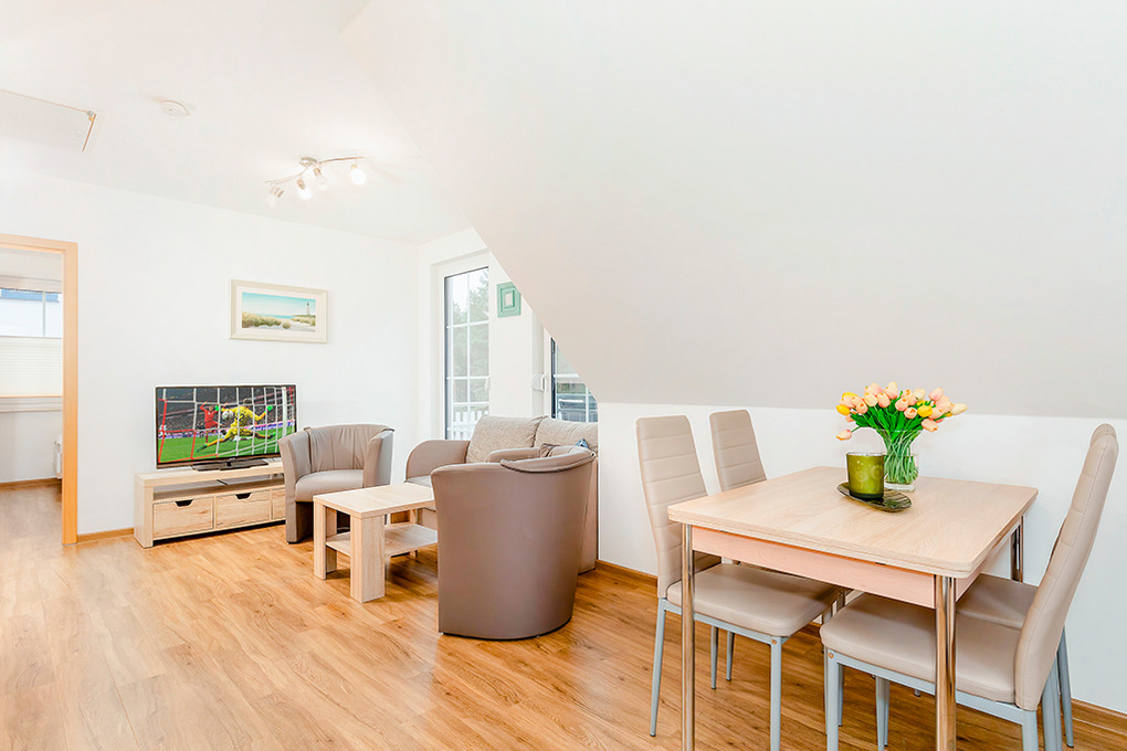 D 16.10A Wohnung 2-4 Pers.: 3-Zimmerwohnung mit 55 qm Wohnfläche, 1. Etage (eigener Zugang, Dachschrägen). Wohn-/Essraum mit gemütlicher Sofa-Sitzgruppe, Sat-TV, Radio/CD, Esstisch, Küchenzeile (Backofen, Mikrowelle, Spülmaschine). Doppelzimmer. 2-Bettzimmer. Bad/WC. Süd-Balkon mit Sitzmöbeln.