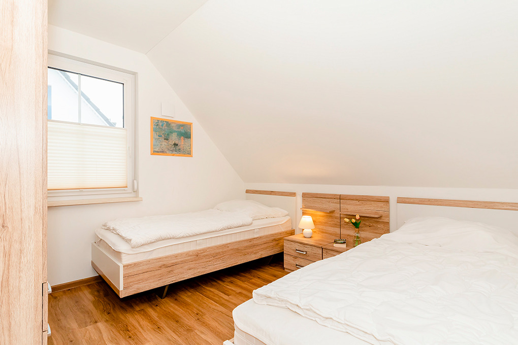 Haus: Schönes Ferienhaus mit zwei Ferienwohnungen, 2016 neu gebaut. Geschmackvolle Einrichtung, moderne Ausstattung: Sat-TV, Radio/CD. Bäder mit Haarföhn, Handtuchwärmern. Fußbodenheizung. Süd-Terrasse oder Süd-Balkon (Sitzmöbel). 500 qm großer Gemeinschaftsgarten mit Spiel- und Liegewiese. Gartenhaus für Fahrräder. 1 Pkw-Stellplätze pro Wohnung. Hinweis: Bei gemeinsamer Anmietung beider Fewos ergibt sich ein Ferienhaus für 4-8 Pers. zum Alleinbewohnen.