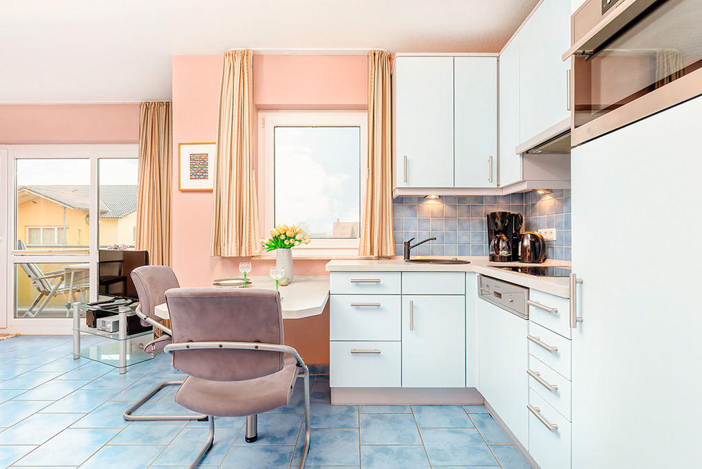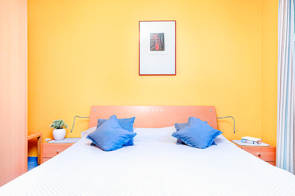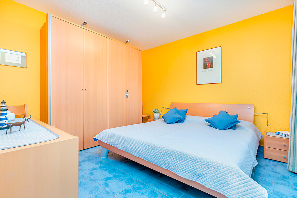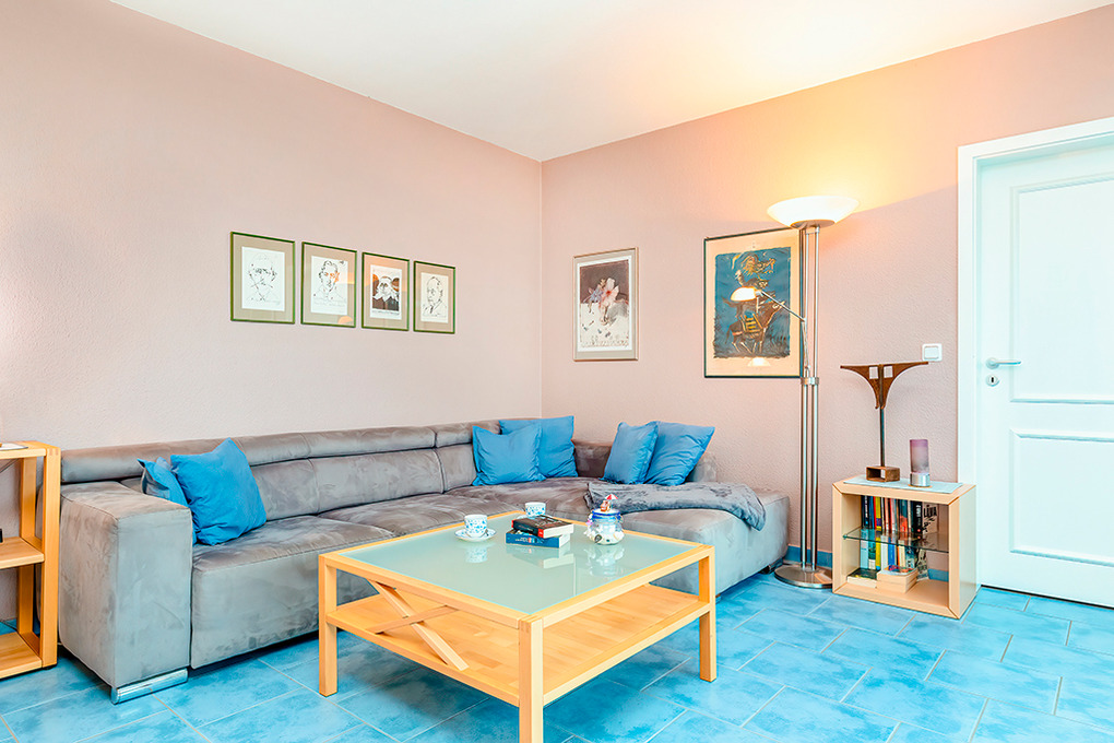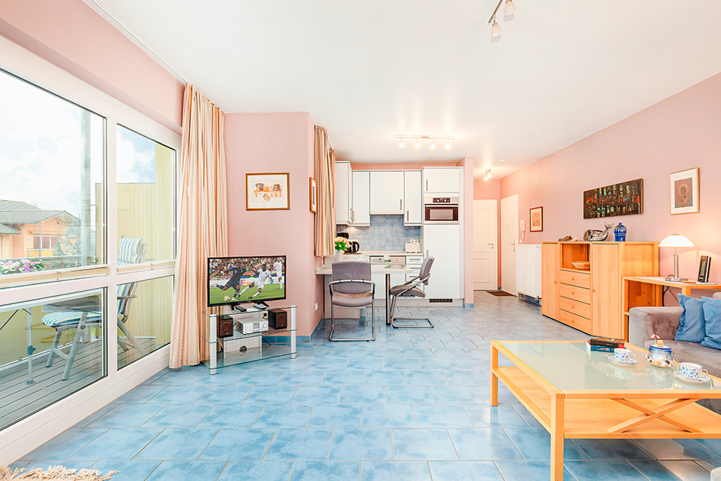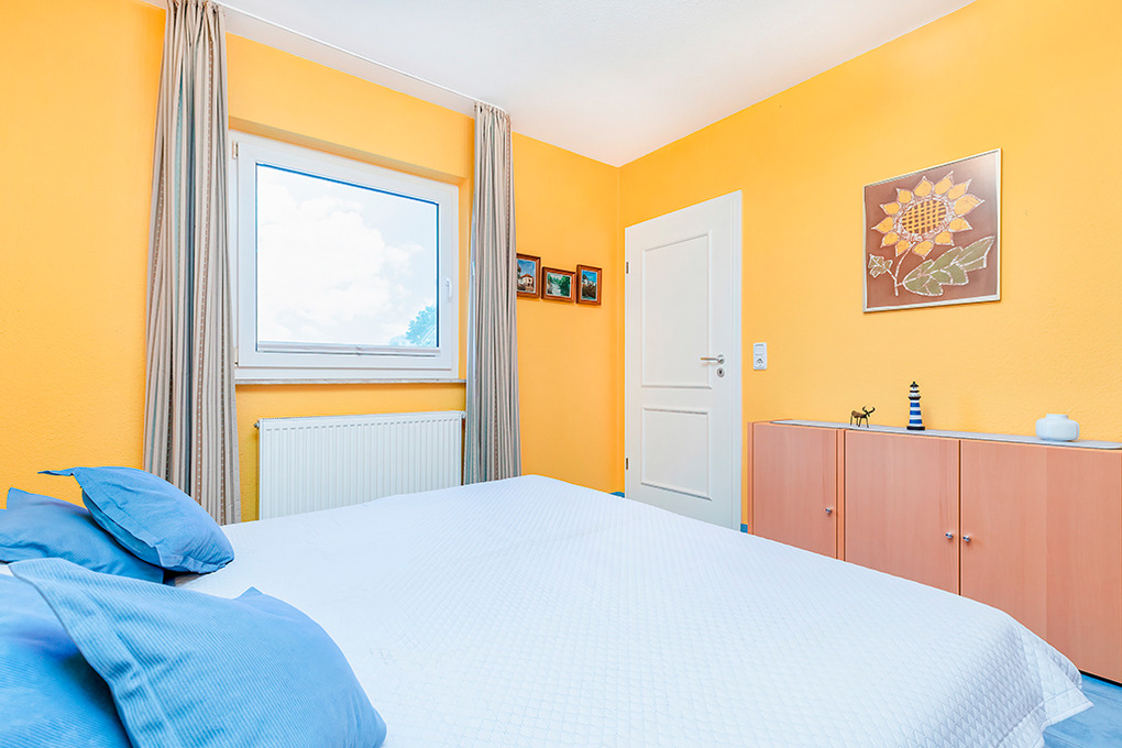 D 16.19 Wohnung 2 Pers.: 2-Zimmerwohnung mit 60 qm Wohnfläche, 1. Etage. Heller Wohn-/Essraum mit Couchgarnitur, Kabel -TV, DVD, Radio/CD, Esstisch, gut ausgestatteter Küchenzeile (Backofen, Mikrowelle, Spülmaschine). Doppelzimmer. Bad: Du, WB, WC, Waschmaschine. Kleiner Abstellraum. Balkon mit Sitzmöbeln.