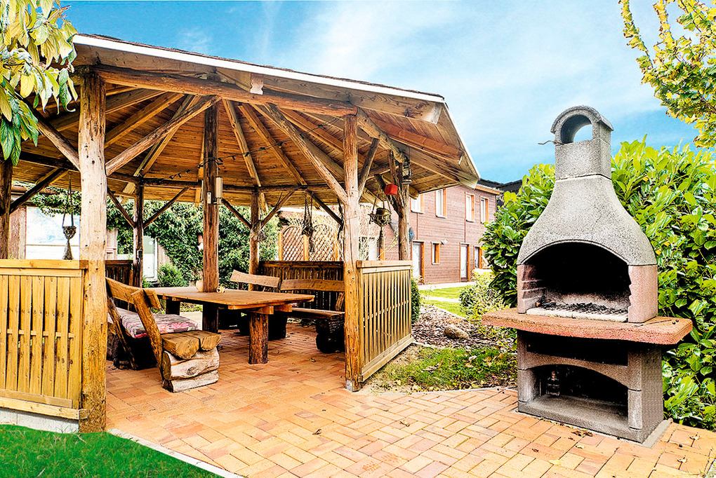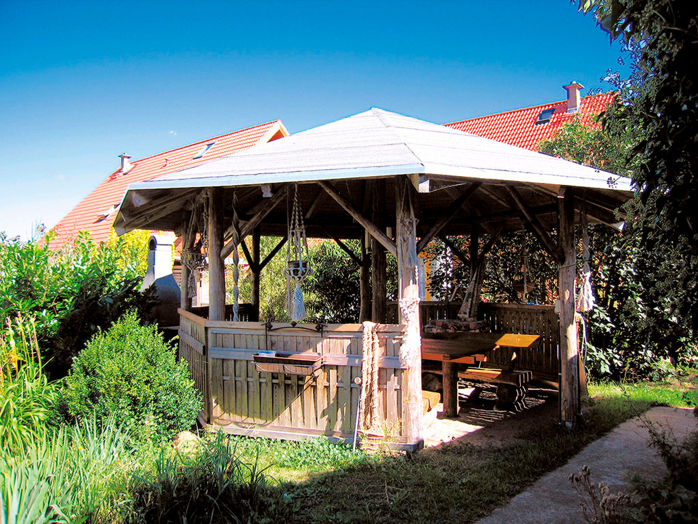 Haus: Zwei schöne Ferienhäuser mit 3 identischen Fewos. Kostenloser Internetzugang (W-Lan). Fußbodenheizung. Kleiner Gemeinschaftsgarten mit Pavillon, Grill. Pkw-Stellplätze am Haus. Nichtraucherwohnungen.
