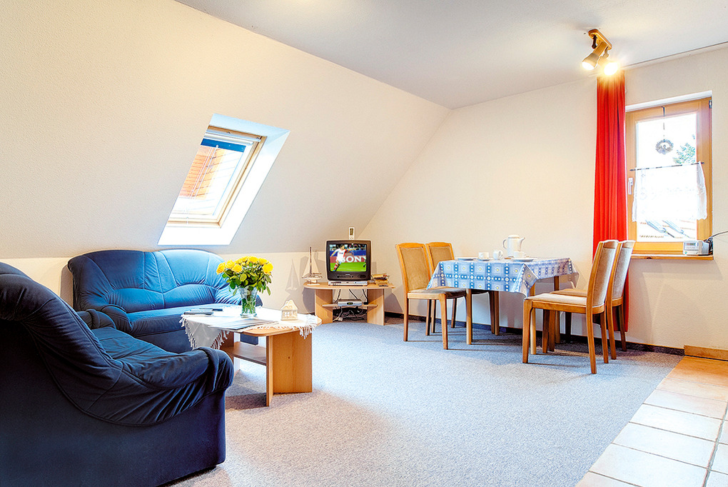 D 16.20 Wohnung 2-4 Pers.: 3-Zimmerwohnung, 50 qm Wohnfläche über 2 Etagen. 1. Etage: Gemütlicher Wohn-/Essraum mit Sat-TV, Radio, Couchgarnitur, Esstisch, Pantry-Küche. Doppelzimmer. Bad/WC. Raumspartreppe ins Dachgeschoss (Dachschrägen): 2-Bettzimmer mit kl. Sitzecke, offen zur 1. Etage.