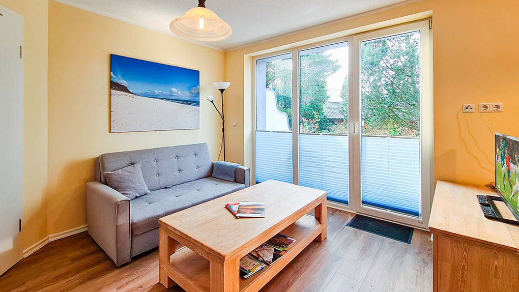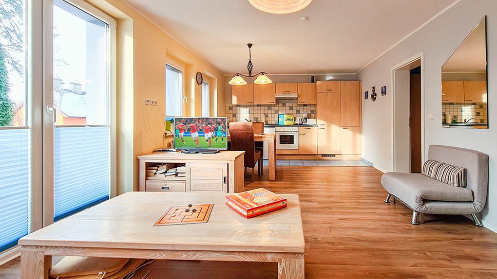 D 16.22 Wohnung 2-4 Pers.: 2-Zimmerwohnung, 44 qm Wohnfläche, Parterre. Gemütlicher Wohn-/Essraum mit Ausziehcouch (2 Pers.), Sat-TV, Esstisch, Küchenzeile (Backofen, Spülmaschine). Doppelzimmer. Bad/WC. Terrasse mit Sitzmöbeln.