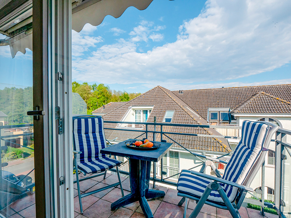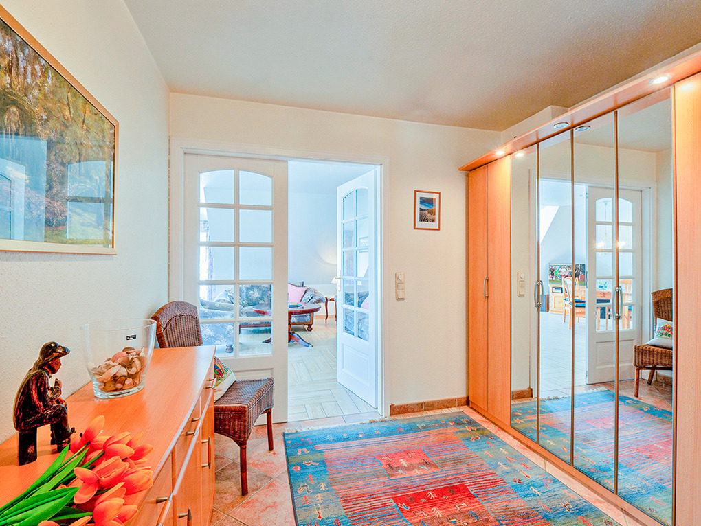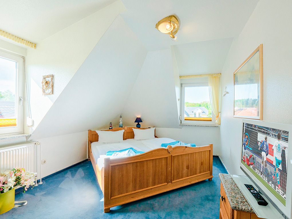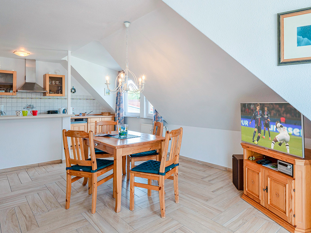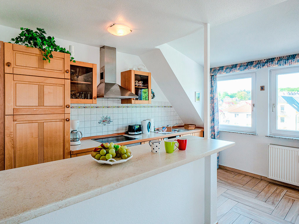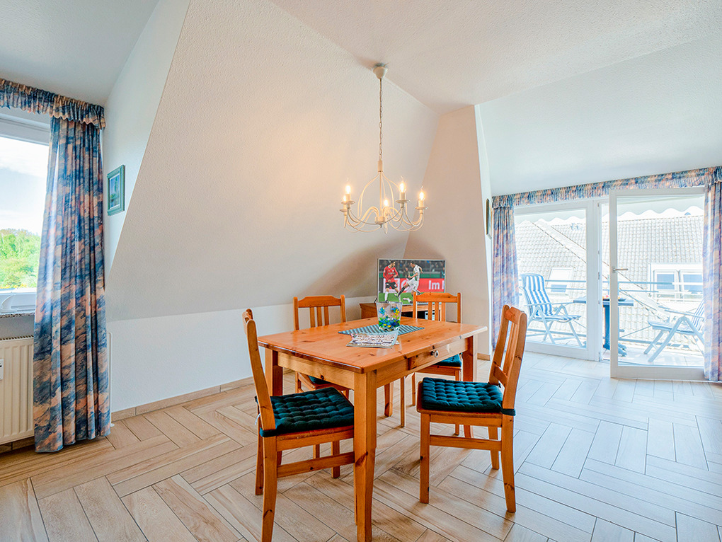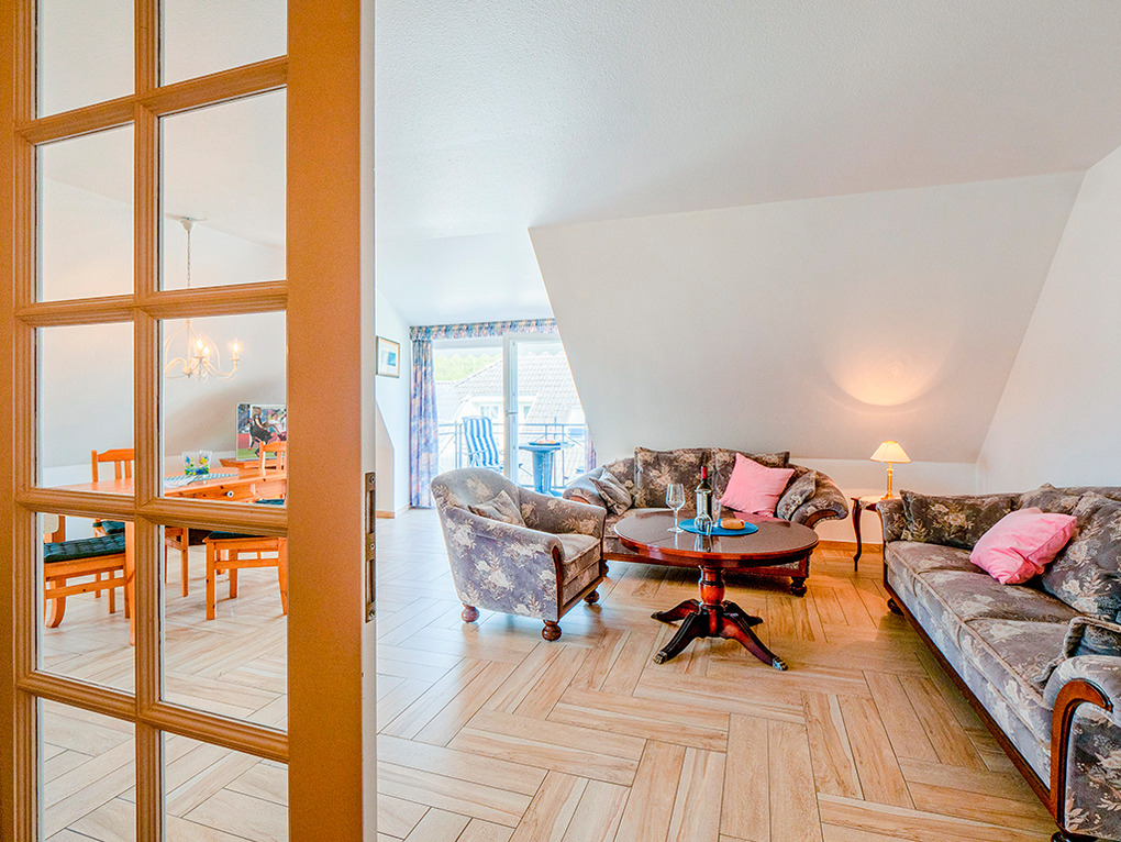 D 17.22 Wohnung 1-3 Pers.: komfortable 2-Zimmerwohnung mit 61 qm Wohnfläche, 2. Etage (Dachgeschoß). Schöner Wohn-/Essraum mit Couchgarnitur, Sat-TV, Radio/CD, Esstisch, Einbauküche (Backofen, Mikrowelle, Spülmaschine). 3-Bettzimmer mit Doppelbett, Einzelbett, Sat-TV. Bad/BW/WC. Balkon mit Sitzmöbeln (Südwestlage). Gartenmitbenutzung. Grill.
