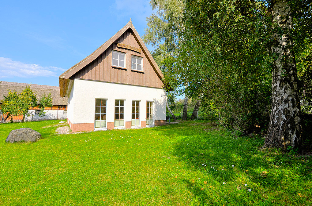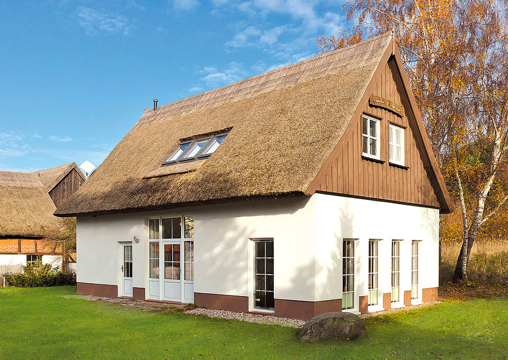 Haus: Schönes Ferienhaus mit Reetdach auf einem 700 qm großen Gartengrundstück. Blick zum Achterwasser aus der 1. Etage. Moderne, freundliche Einrichtung. Zentralheizung. Terrasse mit Gartenmöbeln, Grill. Stellplatz für 2 Pkw, Unterstellplatz für Fahrräder. Nichtraucherhaus.