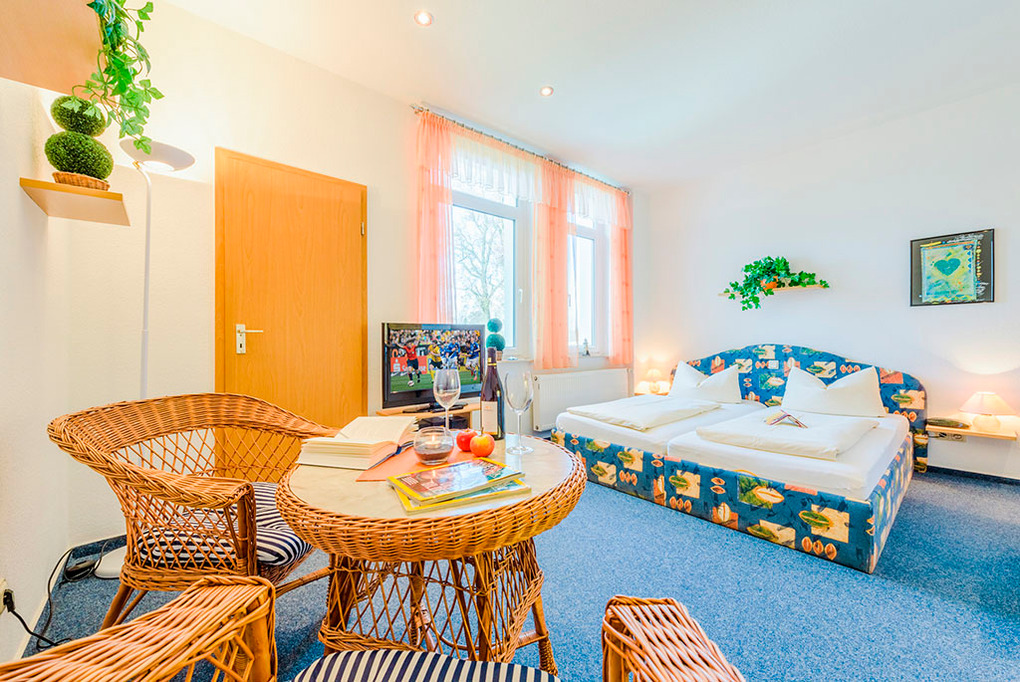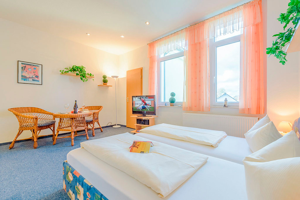 Haus: 8 Ferienwohnungen in einer ansprechend sanierten Villa. Alle Fewos mit TV, Spülmaschine. Internet kostenlos über W-Lan. Zentralheizung. Gemeinschaftlicher kleiner Garten. Fahrradverleih am Haus. Nichtraucherwohnungen.