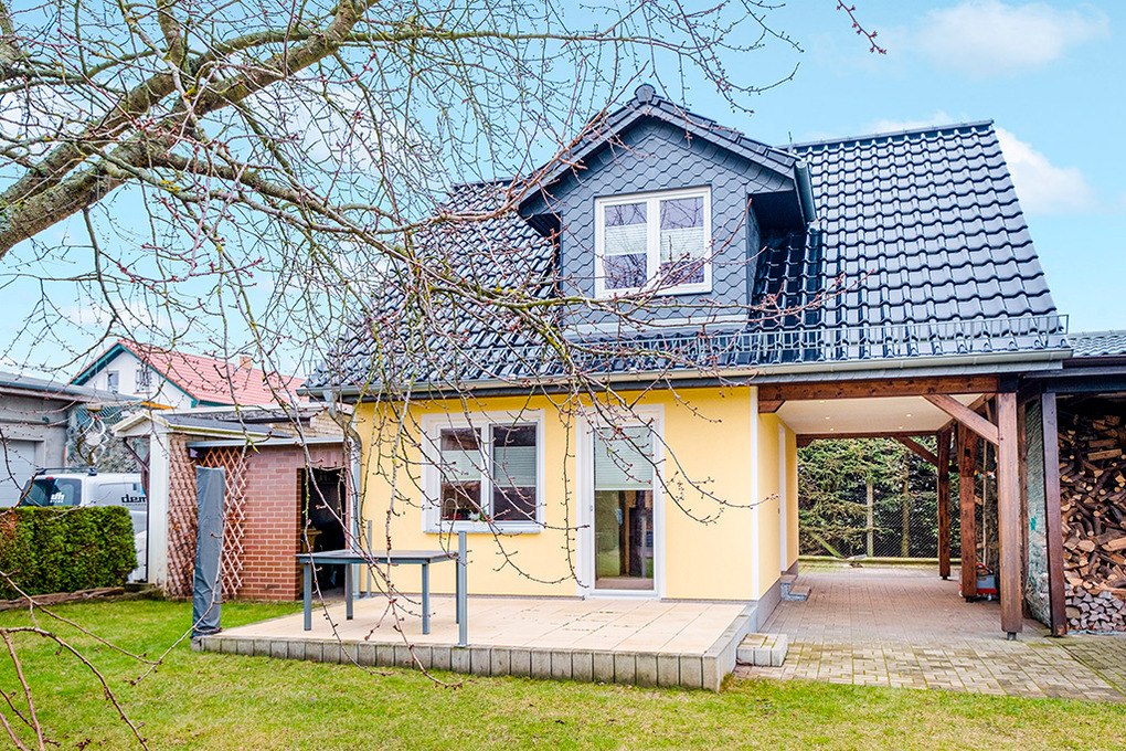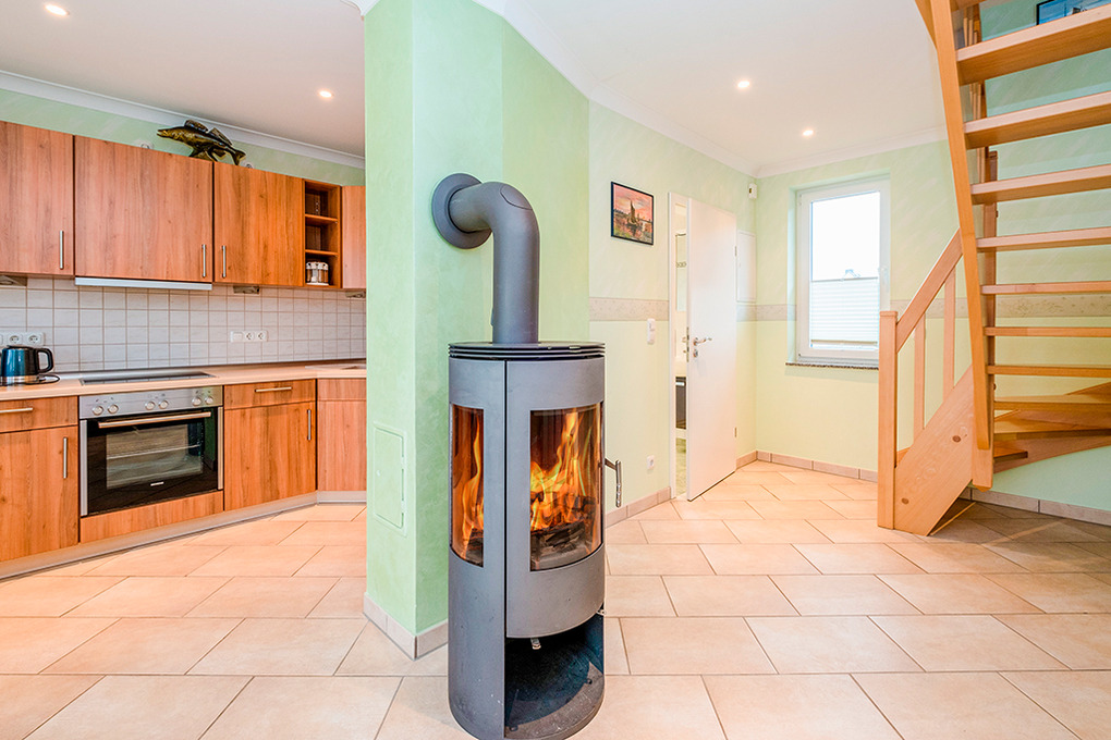 Haus: Modernes Ferienhaus auf einem abgeschlossenen Grundstück. Gepflegte, gemütliche Einrichtung. Kaminofen. Zentralheizung bzw. Fußbodenheizung. Kleiner Garten mit Terrasse und Sitzmöbeln. Ein Pkw-Stellplatz auf dem Grundstück.