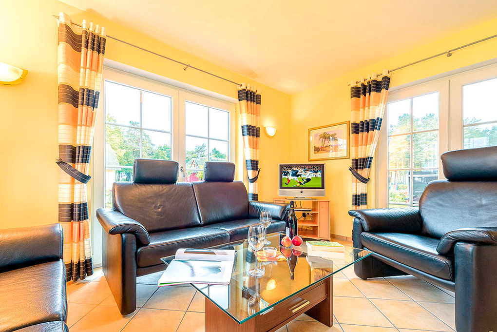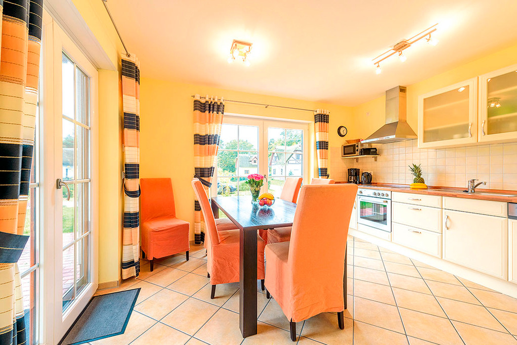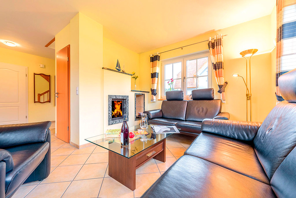 D 28.31 Ferienhaus 2-4 Pers.: Exklusives 3-Zimmerhaus mit 91 qm Wohnfläche über 2 Etagen. Schöner Blick aufs Stettiner Haff. Parterre: Gemütlicher Wohn-/Essraum mit Kamin, Couchgarnitur, Sat-TV, Esstisch, moderner Einbauküche (4 Ceran-Felder, Backofen, Spülmaschine). Bad: Du, Wb, WC. 1. Etage (leichte Dachschrägen): Doppelzimmer. 2-Bettzimmer. Bad: Eck-Bw, Wb, WC.