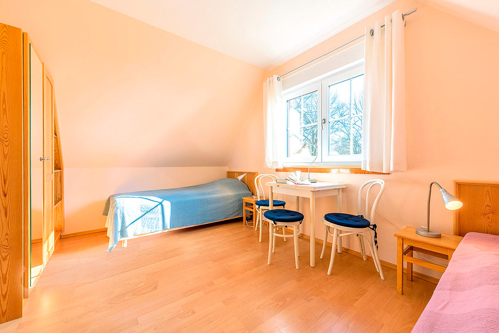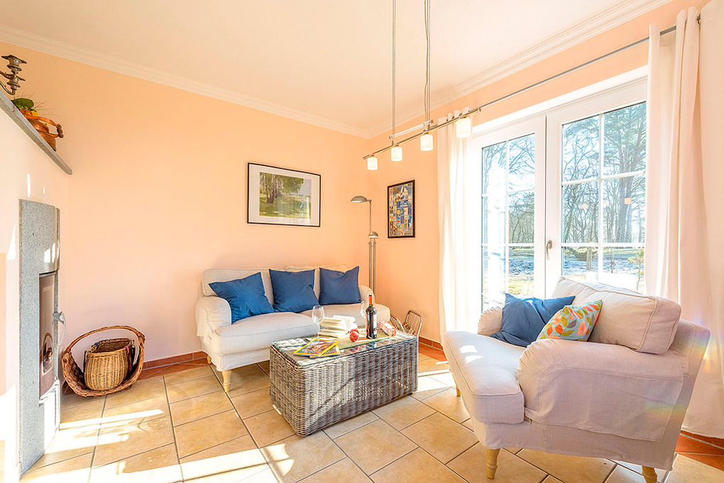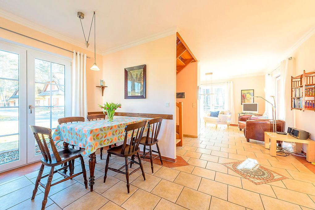 D 28.34 Ferienhaus 2-4 Pers.: Exklusives 3-Zimmerhaus mit 91 qm Wohnfläche über 2 Etagen (Nichtraucherhaus). Unverbauter Blick aufs Stettiner Haff. Parterre: Großer Wohn-/Essraum (37 qm) mit Kaminofen, Couchgarnitur, Sat-TV, Esstisch, moderner Einbauküche (Backofen, Spülmaschine). Bad: Du, Wb, WC, Sauna. Treppe in die 1. Etage (leichte Dachschrägen): Doppelzimmer. 2-Bettzimmer. Bad: Bw, Wb, Waschmaschine, WC.