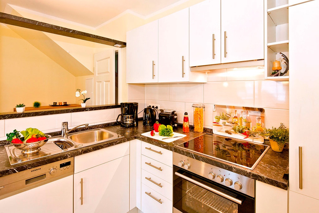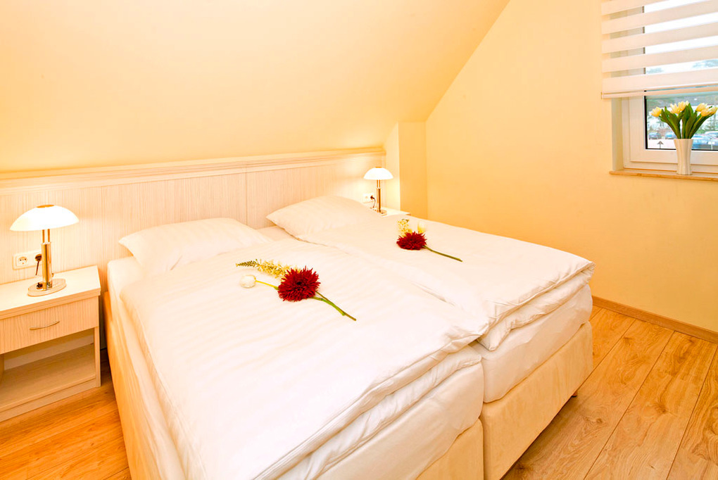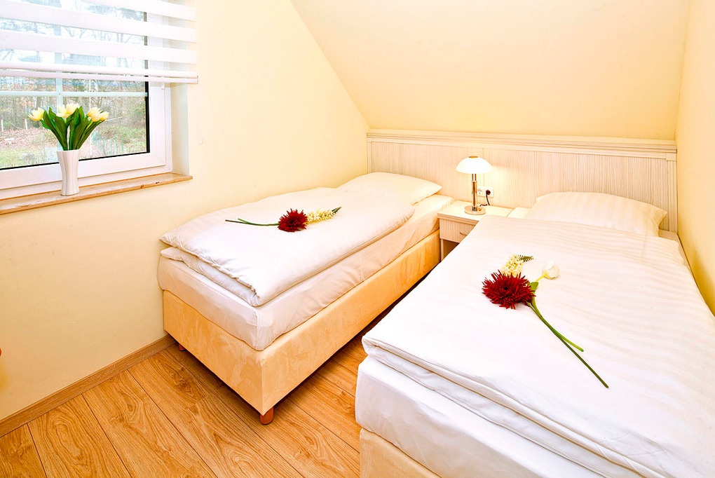 D 28.36 Ferienhaus 2-6 Pers.: Komfortables 3-Zimmer-Ferienhaushälfte mit 69 qm Wohnfläche über 3 Etagen (Nichtraucherhaus). Parterre: Heller, freundlicher Wohn-/Essraum mit Kaminofen, Couchgarnitur, Sat-TV, Esstisch, moderner Einbauküche (Backofen, Spülmaschine). Bad/WC. 1. Etage Doppelzimmer. 2-Bettzimmer. Bad/WC. Vom 2-Bettzimmer Treppe in den offenen Spitzboden (max. Stehhöhe 1,85 m): 2 Einzelbetten (empfohlen für Kinder bis 14 Jahre).