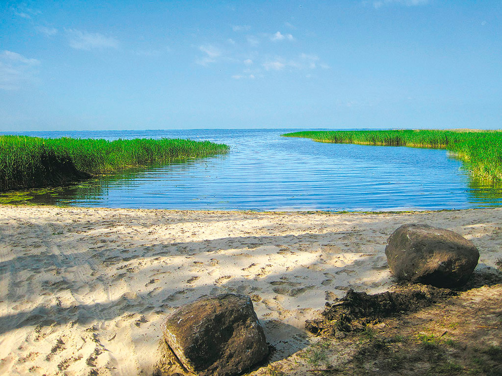 Haus: Großzügig angelegte Ferienhausanlage auf großem gepflegtem Areal (10 ha) mit lichtem Baumbestand. In unmittelbarer Nähe zum Hochufer gelegenes hochwertige, reetgedeckte Ferienhaushälfte mit Kaminofen. 2 separate Schlafzimmer, 2 Bäder. Gehobene Ausstattung mit geschmackvoller Möblierung. Zentralheizung. Kostenloser Internetzugang über W-Lan. Terrasse mit Sitzmöbeln, Grill. 2 Pkw-Stellplätze.