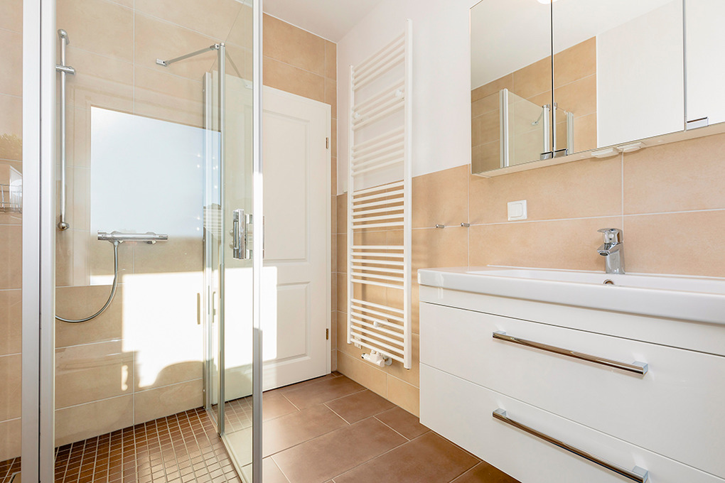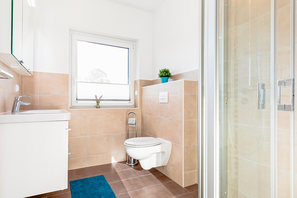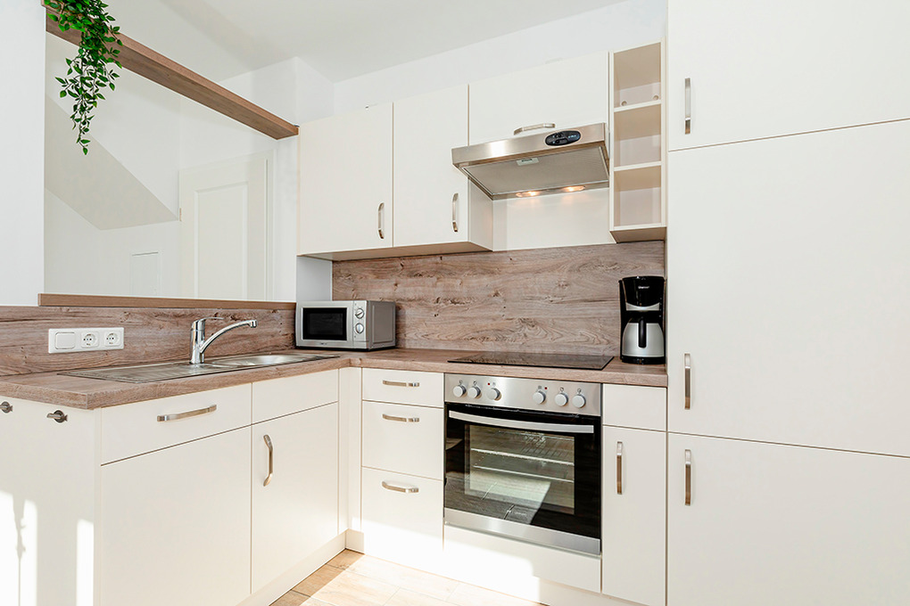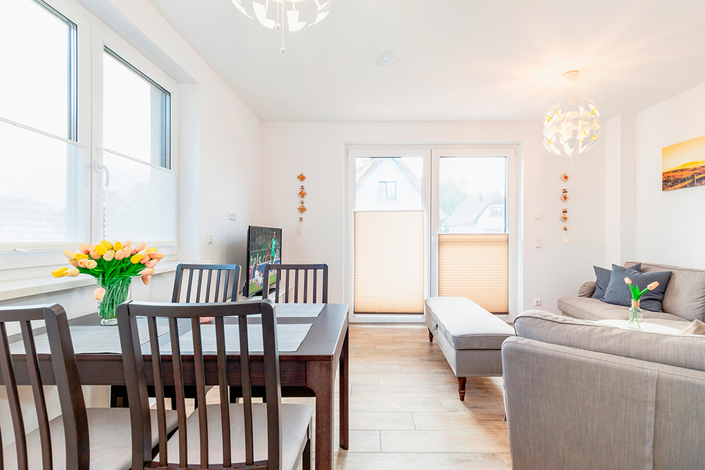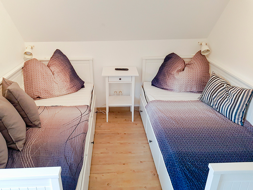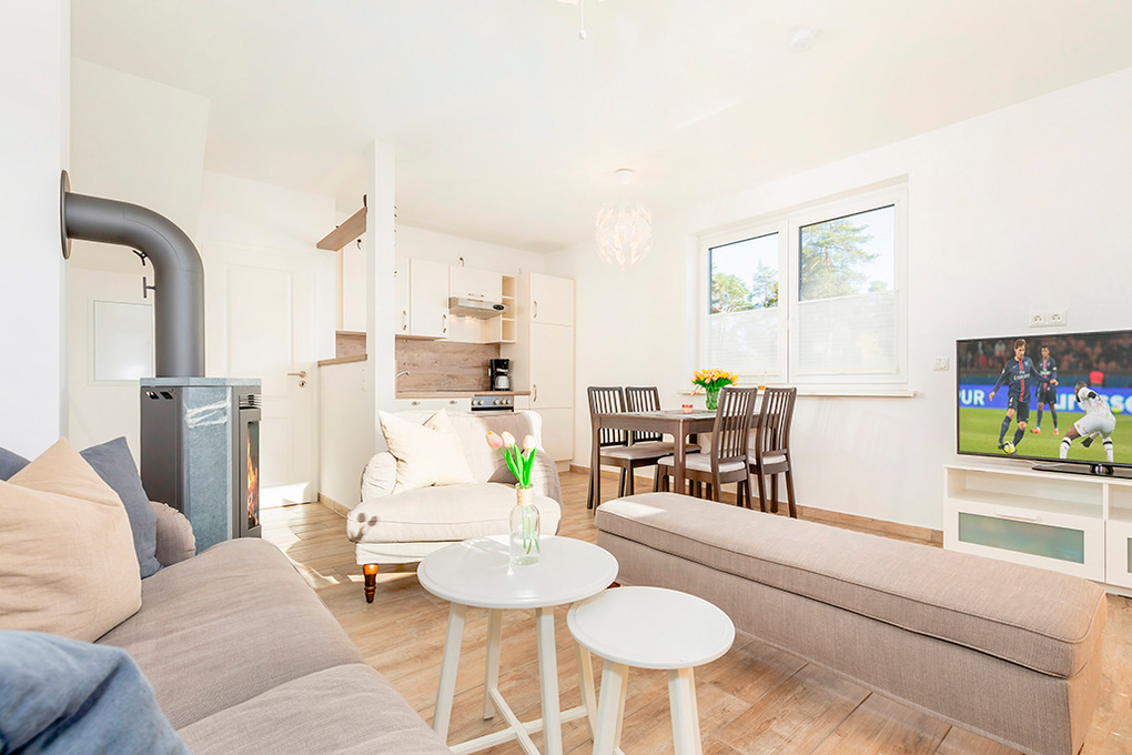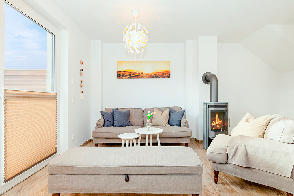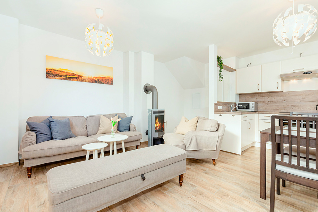 D 28.37A Ferienhaus 2-4 Pers.: Komfortables 3-Zimmer-Ferienhaushälfte mit 69 qm Wohnfläche über 2 Etagen (Nichtraucherhaus). Parterre: Heller, freundlicher Wohn-/Essraum mit Kaminofen, Couchgarnitur, Sat-TV, DVD-Player, Esstisch, moderner Einbauküche (Backofen, Spülmaschine). Bad/WC. 1. Etage Doppelzimmer mit Sat-TV. 2-Bettzimmer mit Sat-TV. Bad/WC.