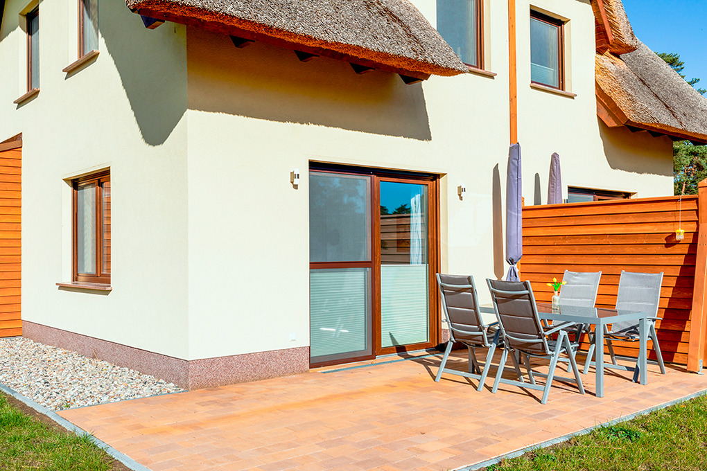 Haus: Großzügig angelegte Ferienhausanlage auf großem gepflegtem Areal (10 ha) mit lichtem Baumbestand. In unmittelbarer Nähe zum Hochufer gelegene hochwertige, reetgedeckte Ferienhaushälfte mit Kaminofen. 2 separate Schlafzimmer, 2 Bäder. Gehobene Ausstattung mit geschmackvoller Möblierung. Zentralheizung. Kostenloser Internetzugang über W-Lan. Terrasse mit Sitzmöbeln, Grill. Abstellraum mit 2 Fahrrädern. 1 Pkw-Stellplatz.