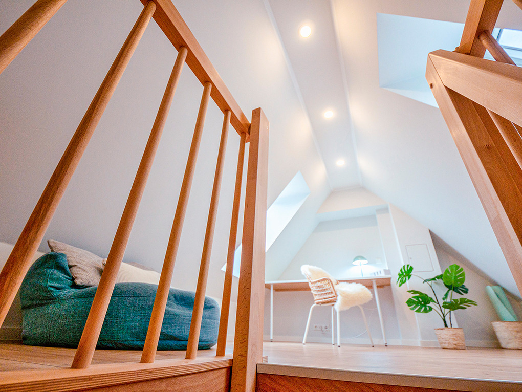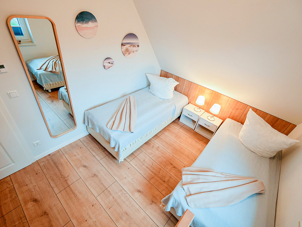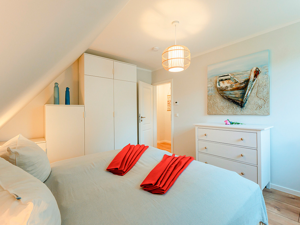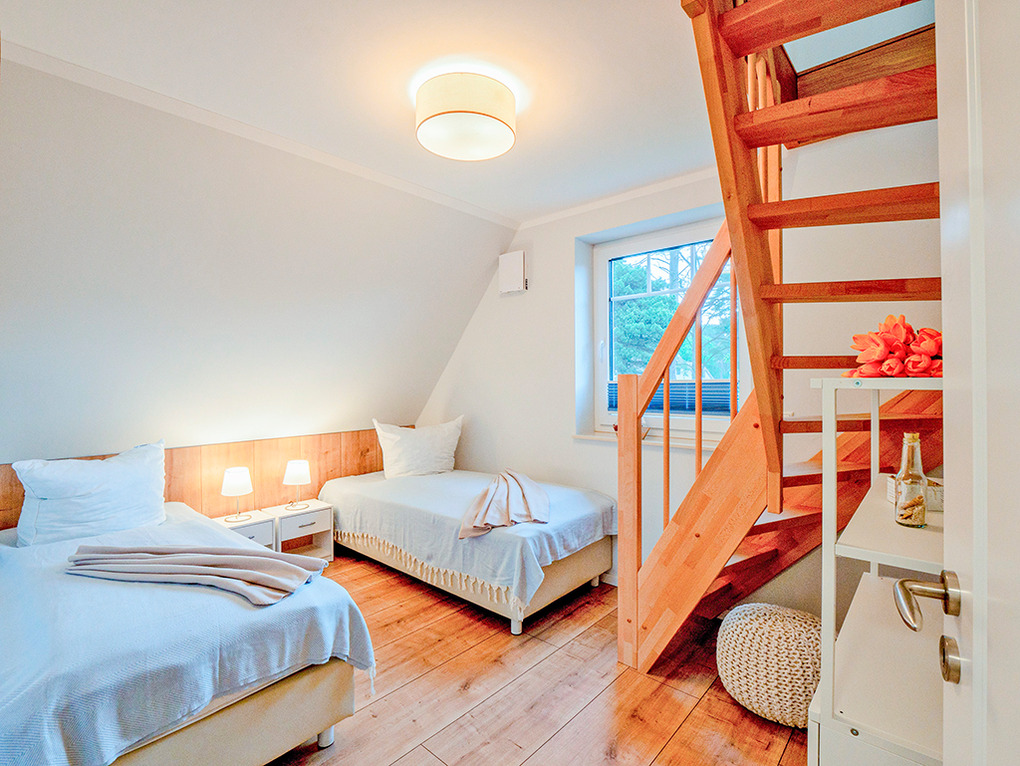 D 28.40 Ferienhaus 1-4 Pers.: Komfortables 3-Zimmer-Ferienhaushälfte mit 68 qm Wohnfläche über 3 Etagen (Nichtraucherhaus). Parterre: Heller, freundlicher Wohn-/Essraum mit Kaminofen, Couchgarnitur, Sat-TV, Esstisch, moderner Einbauküche (Backofen, Spülmaschine). Bad: Du, Wb, WC, Sauna (nutzbar als finnische Sauna und als Biosauna), Waschmaschine. 1. Etage: Doppelzimmer. 2-Bettzimmer. Bad: Eck-BW, Wb, WC. Vom 2-Bettzimmer Treppe in den offenen Spitzboden (max. Stehhöhe 1,85 m): Sitzgarnitur, Schreibtisch.