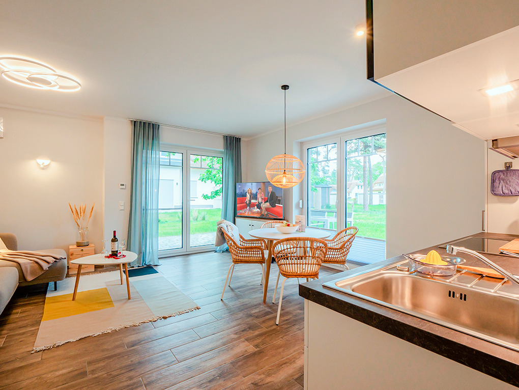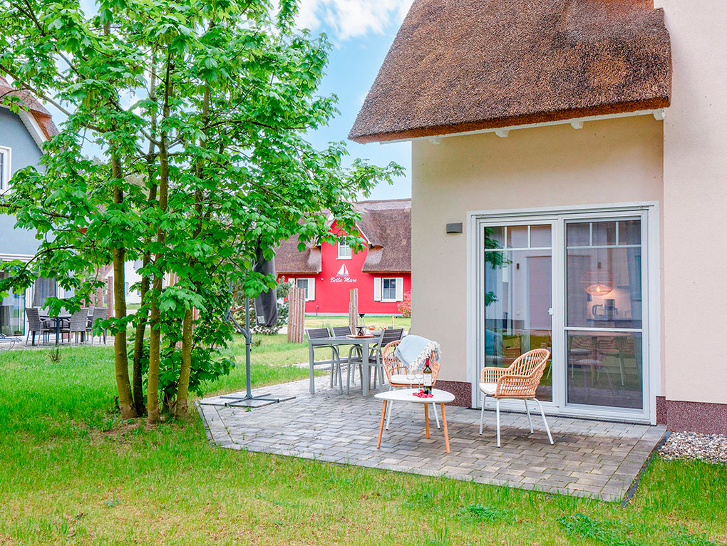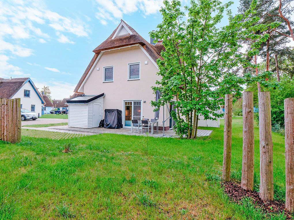 Haus: Großzügig angelegte Ferienhausanlage auf großem gepflegtem Areal (10 ha) mit lichtem Baumbestand. In unmittelbarer Nähe zum Hochufer gelegene hochwertige, reetgedeckte Ferienhaushälfte mit Sauna, Kaminofen. 2 separate Schlafzimmer, 2 Bäder. Gehobene Ausstattung mit geschmackvoller Möblierung, Boxspringbetten. Zentralheizung. Terrasse mit Sitzmöbeln, Grill. 2 Pkw-Stellplätze.